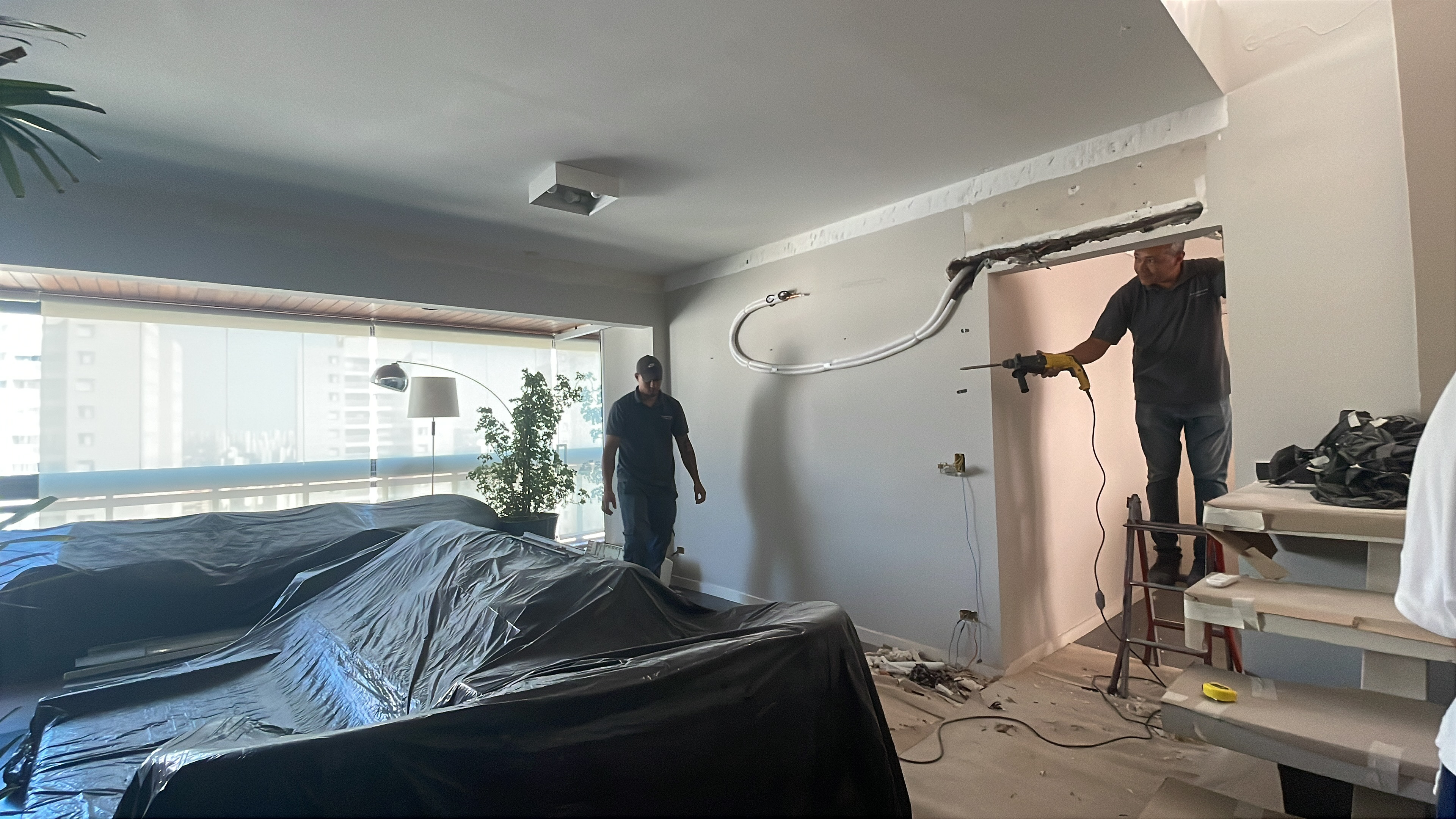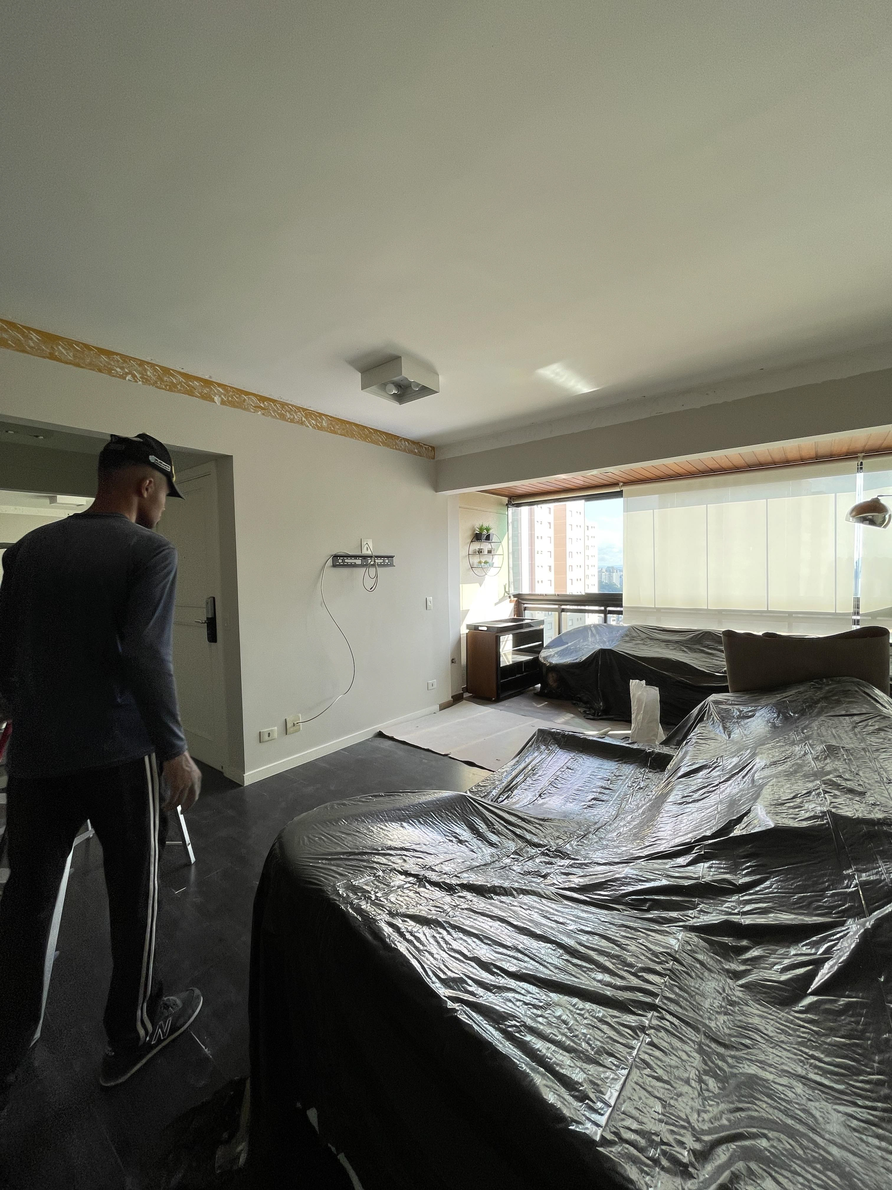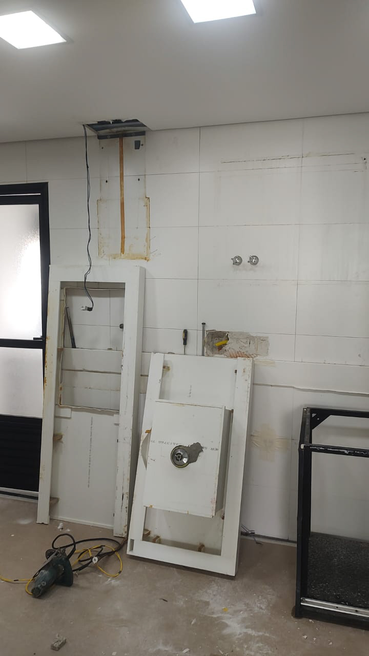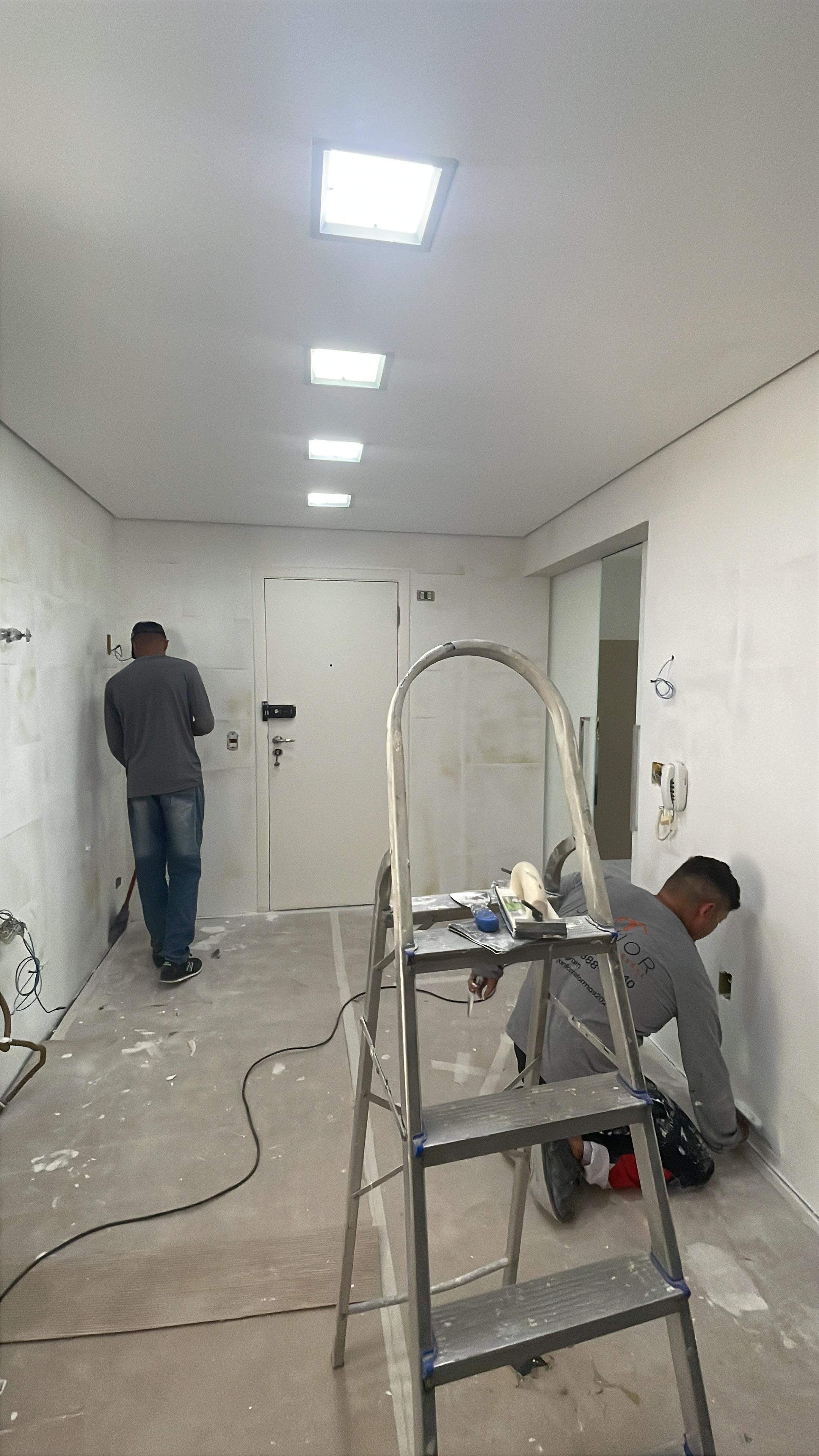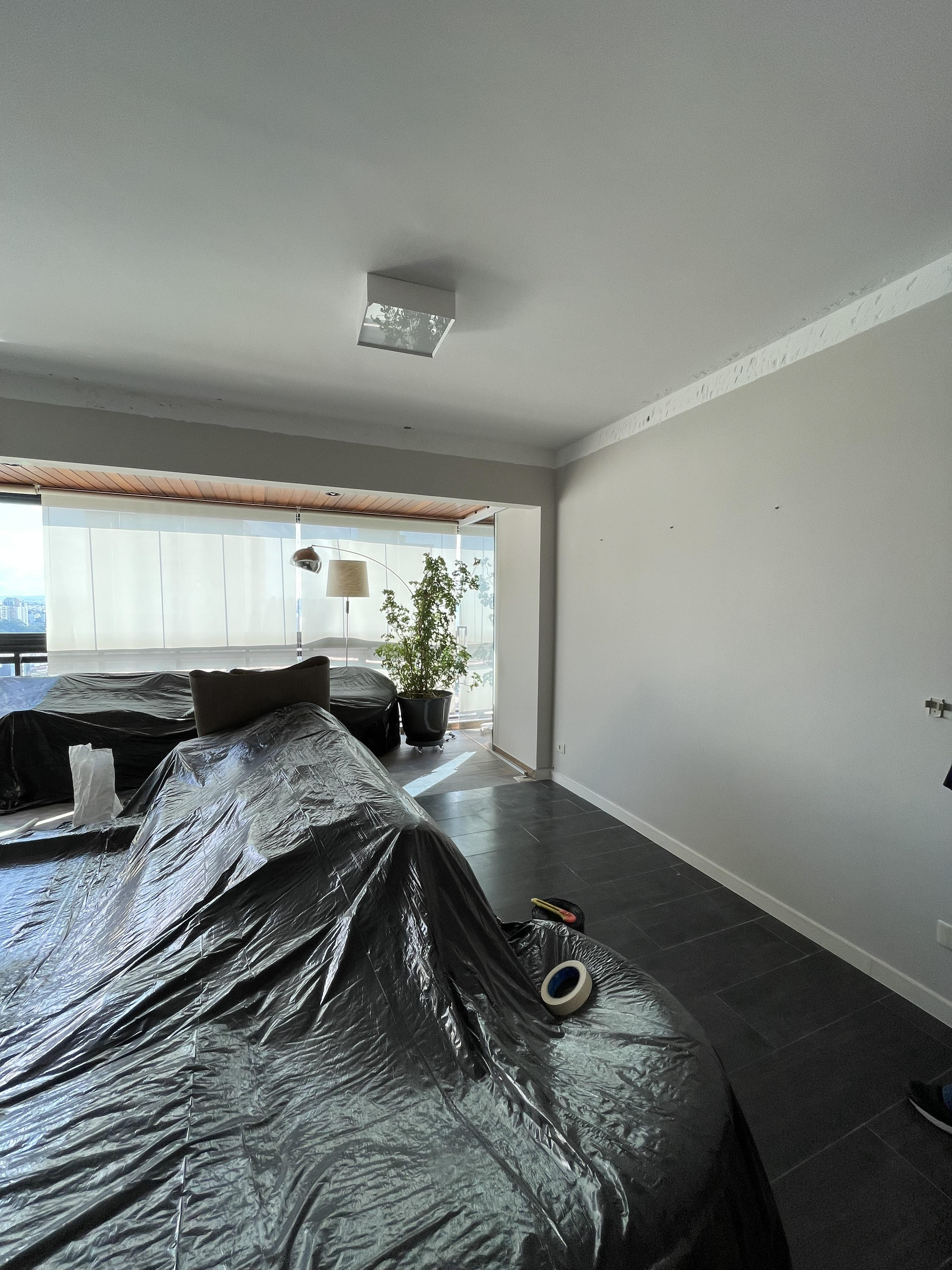 Foi feita a remoção da evaporadora do ar condicionado e ampliação da infra, adequação da elétrica do ar condicionado / Instalação das sancas cortineiro superior / Aplicação de nova demão de massa nas paredes da cozinha / instalação da parede de drywall no living inferior.
