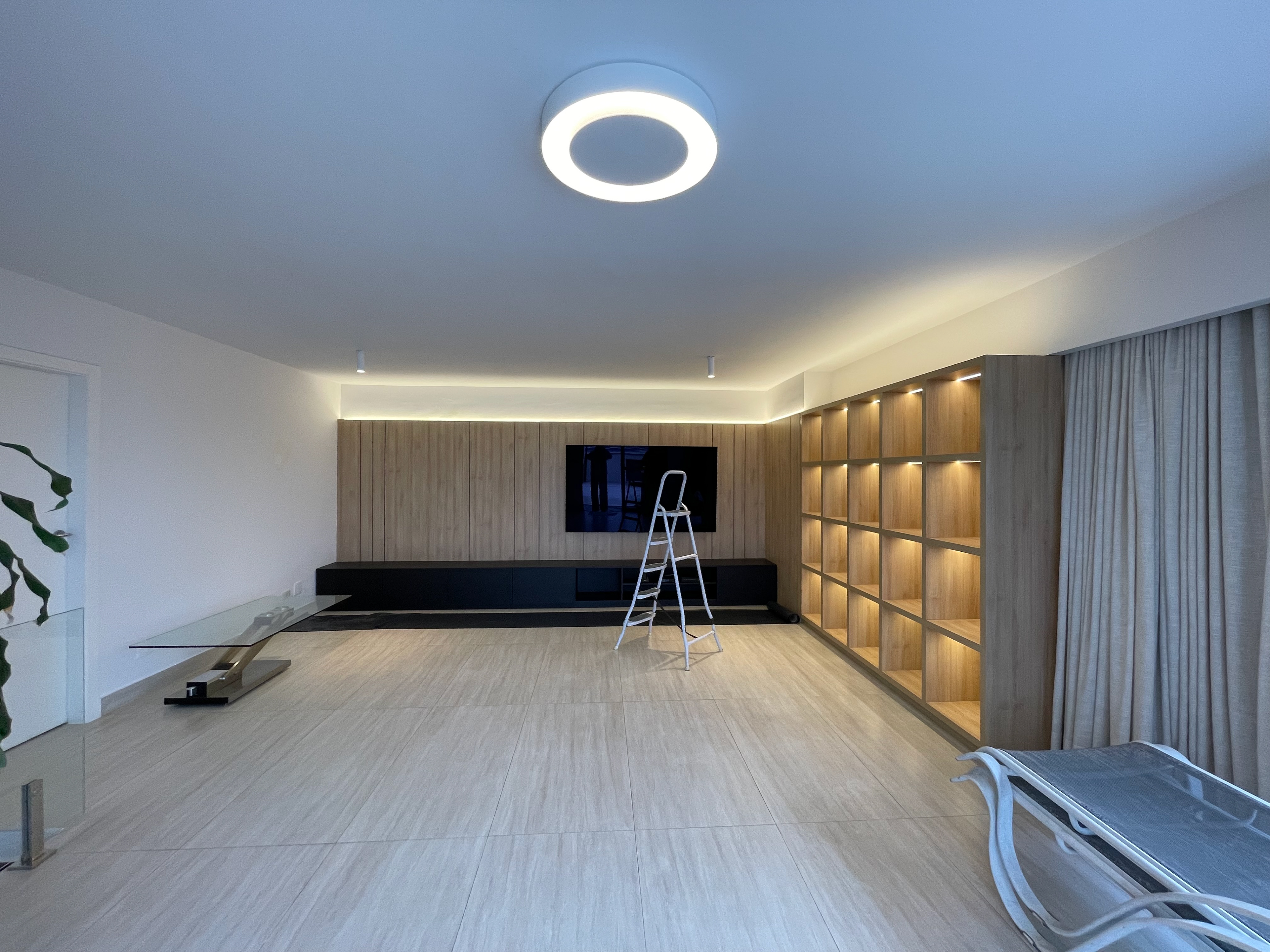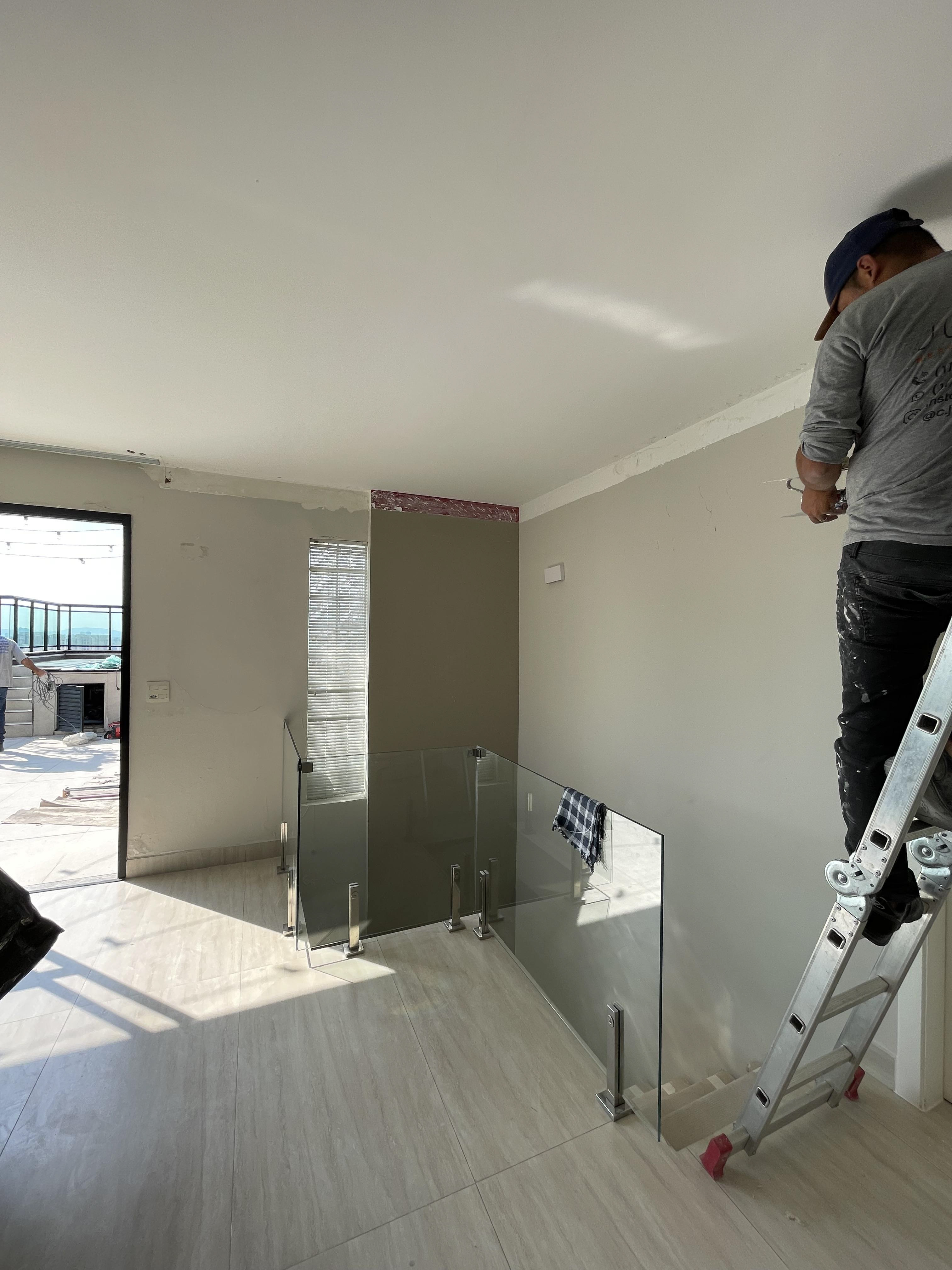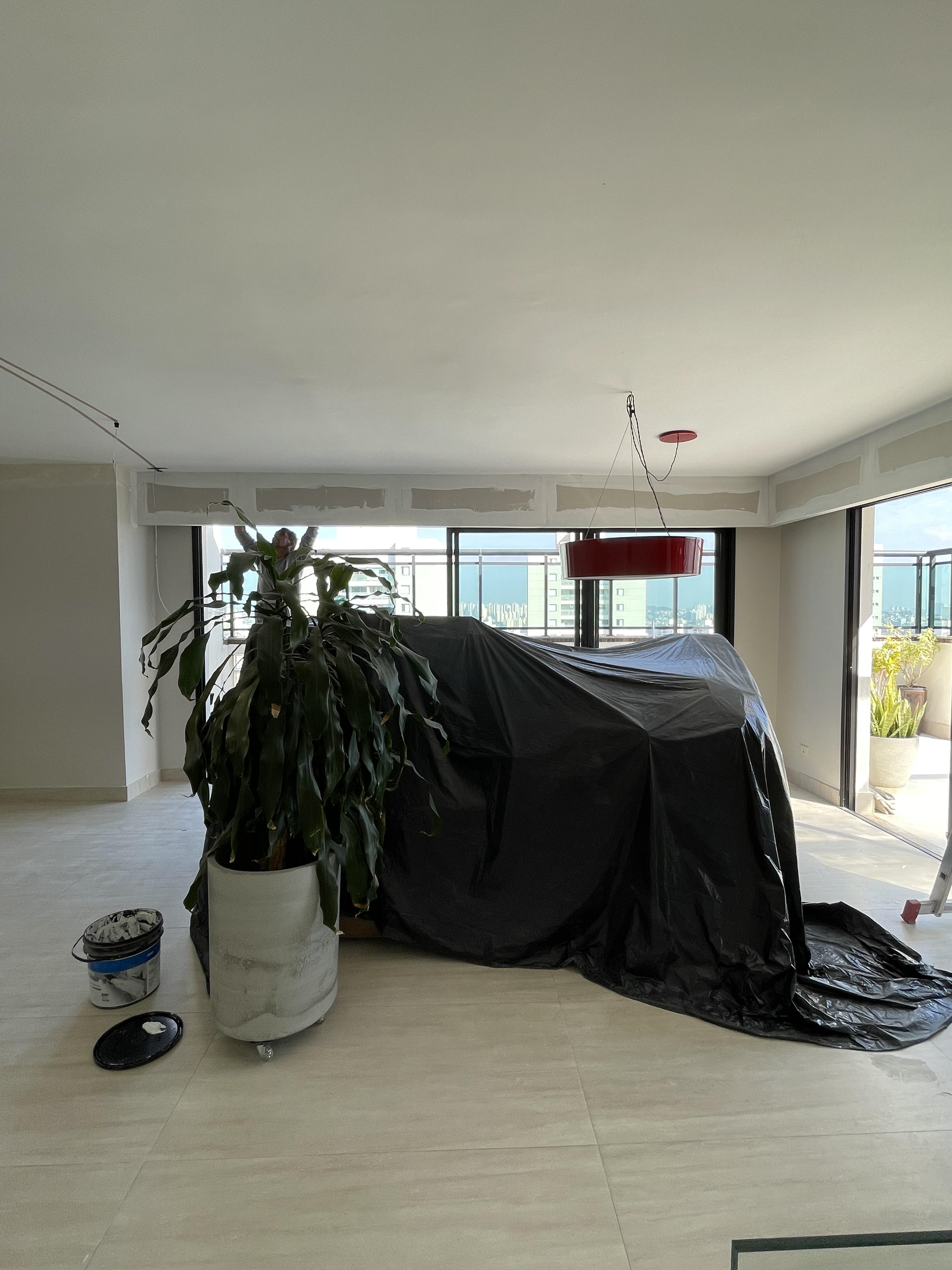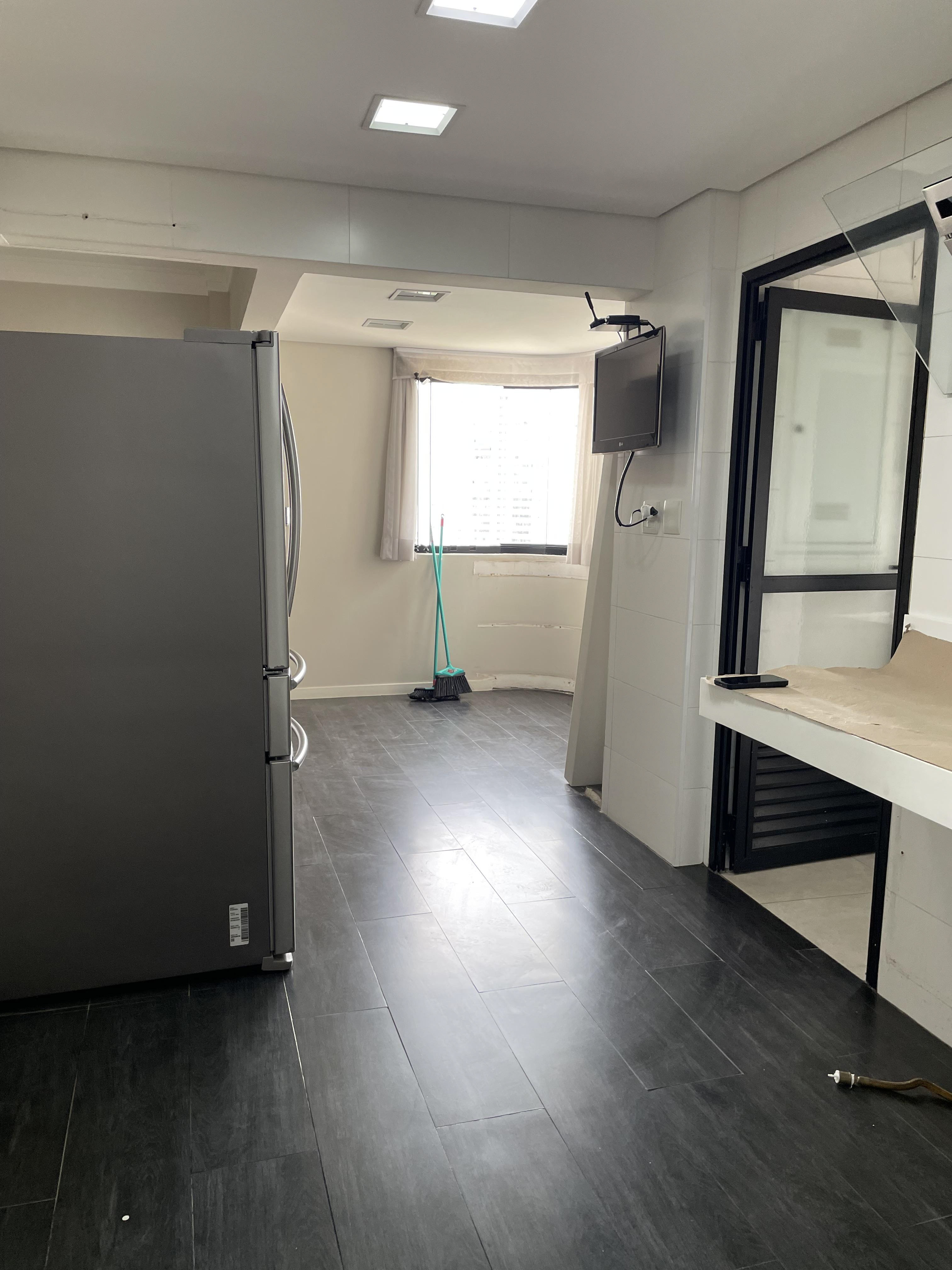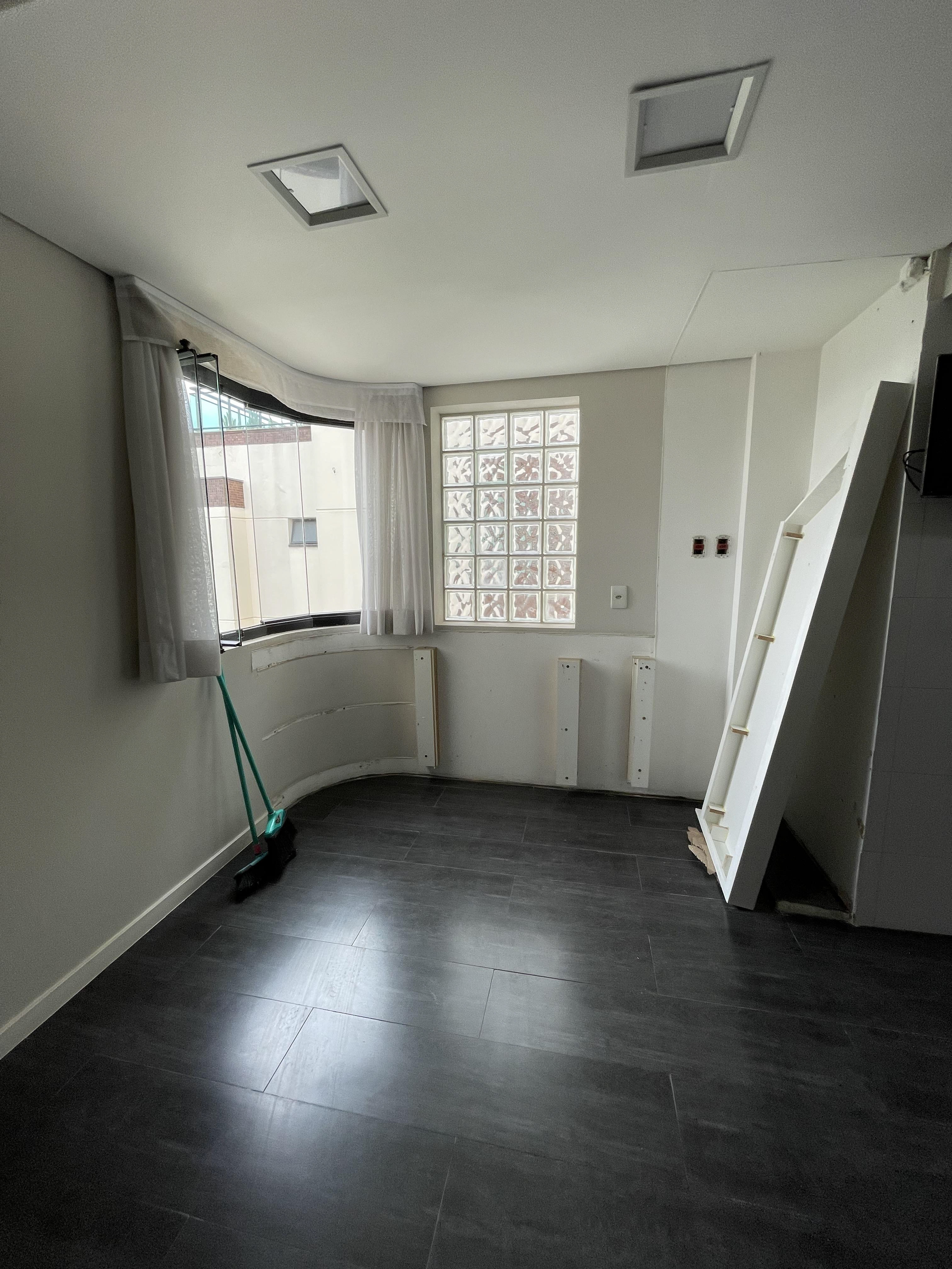 Foi feita a remoção da evaporadora do ar condicionado e ampliação da infra, adequação da elétrica do ar condicionado / Instalação das sancas cortineiro superior / Aplicação de nova demão de massa nas paredes da cozinha / instalação da parede de drywall no living inferior.