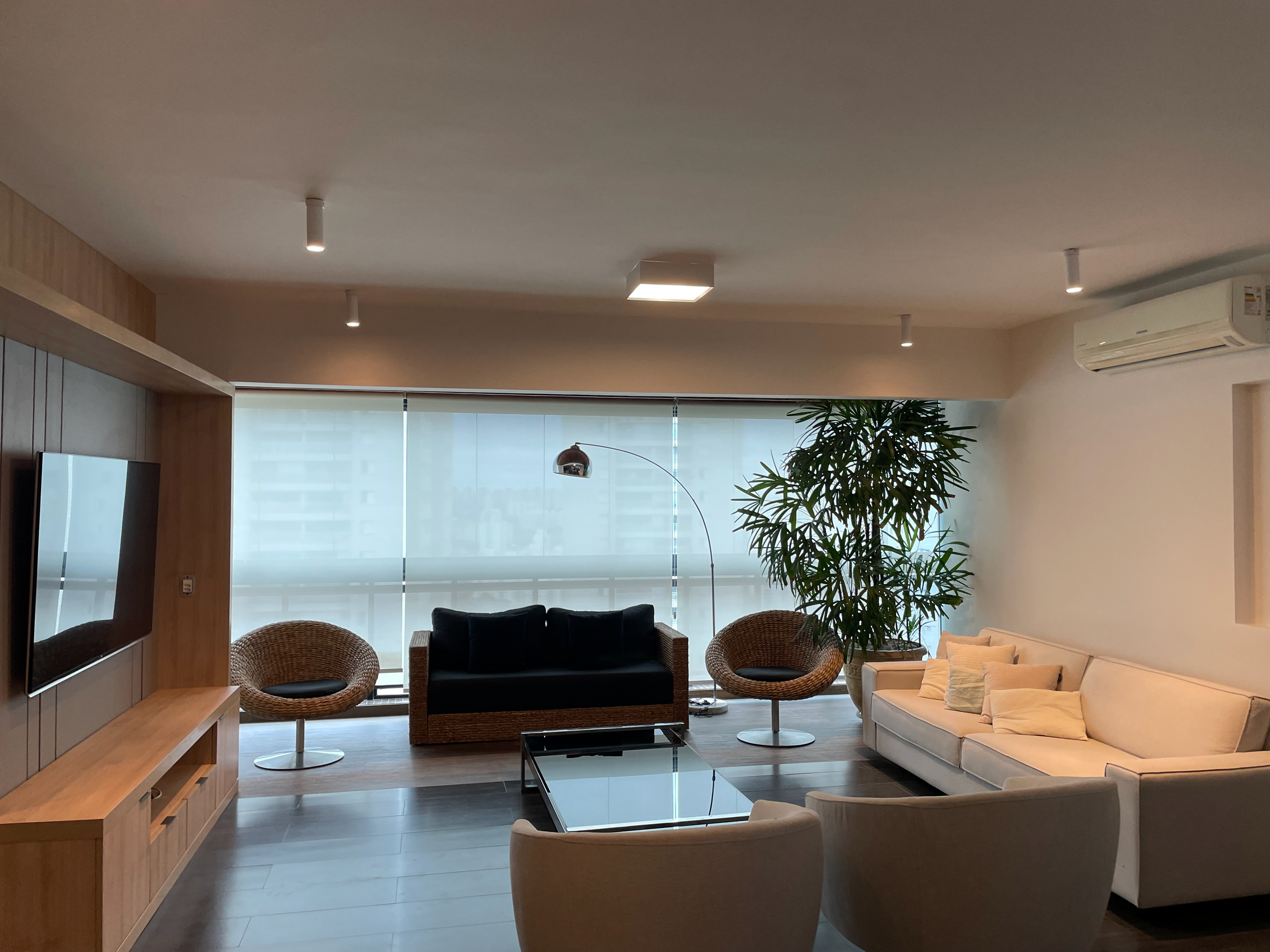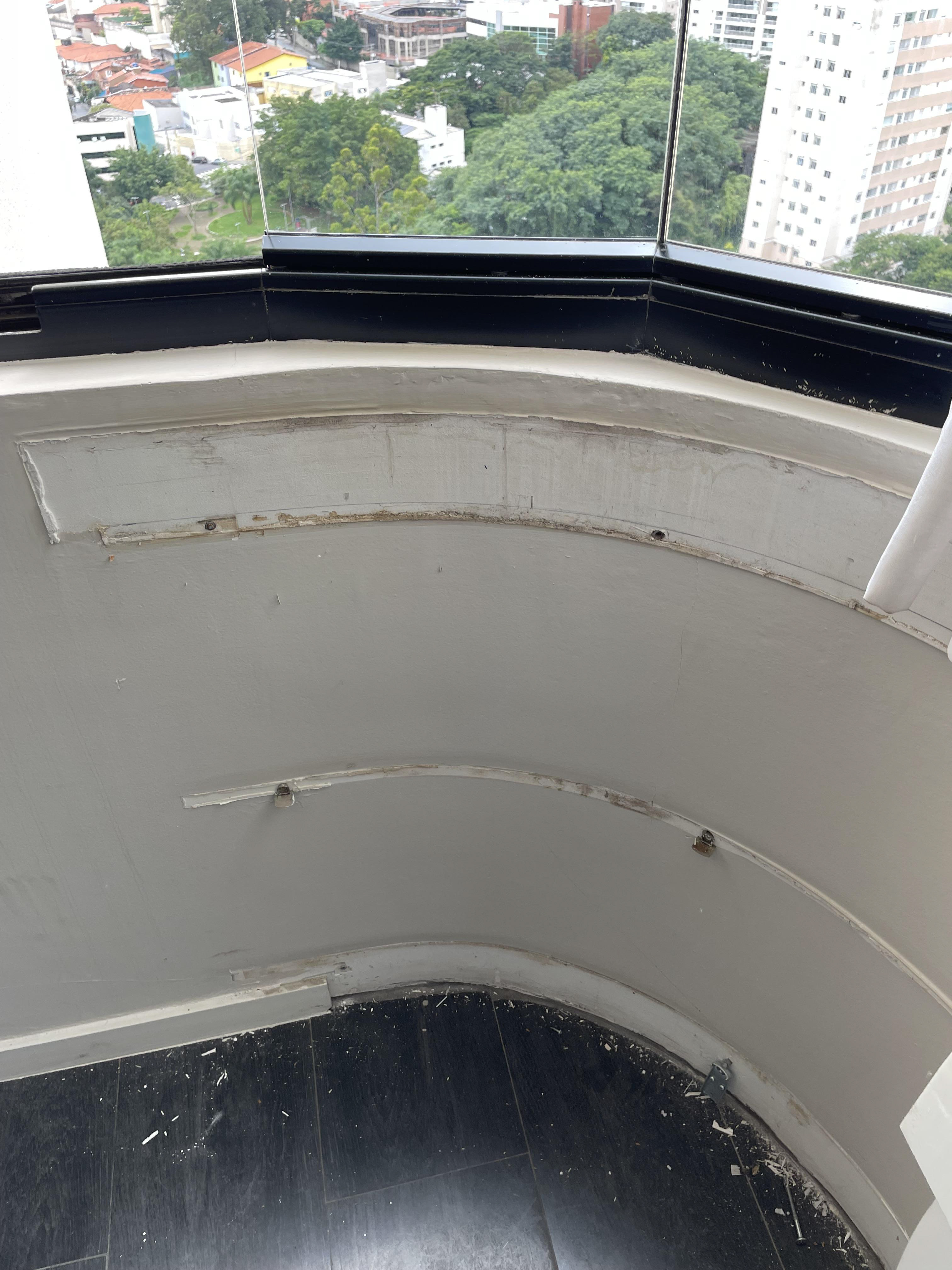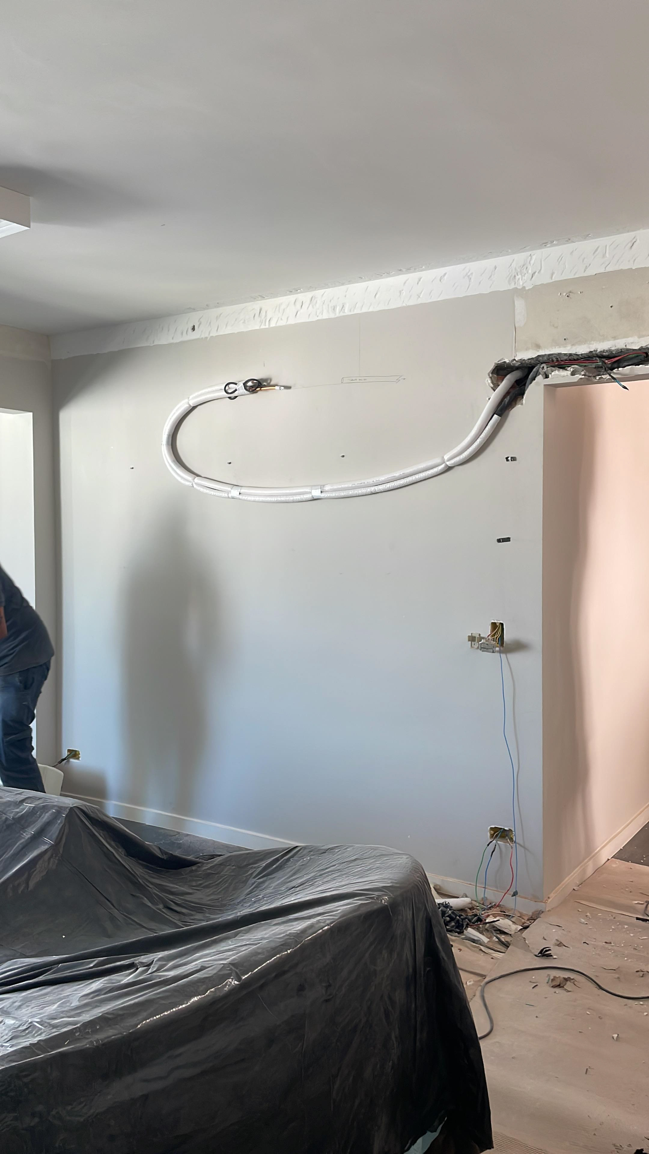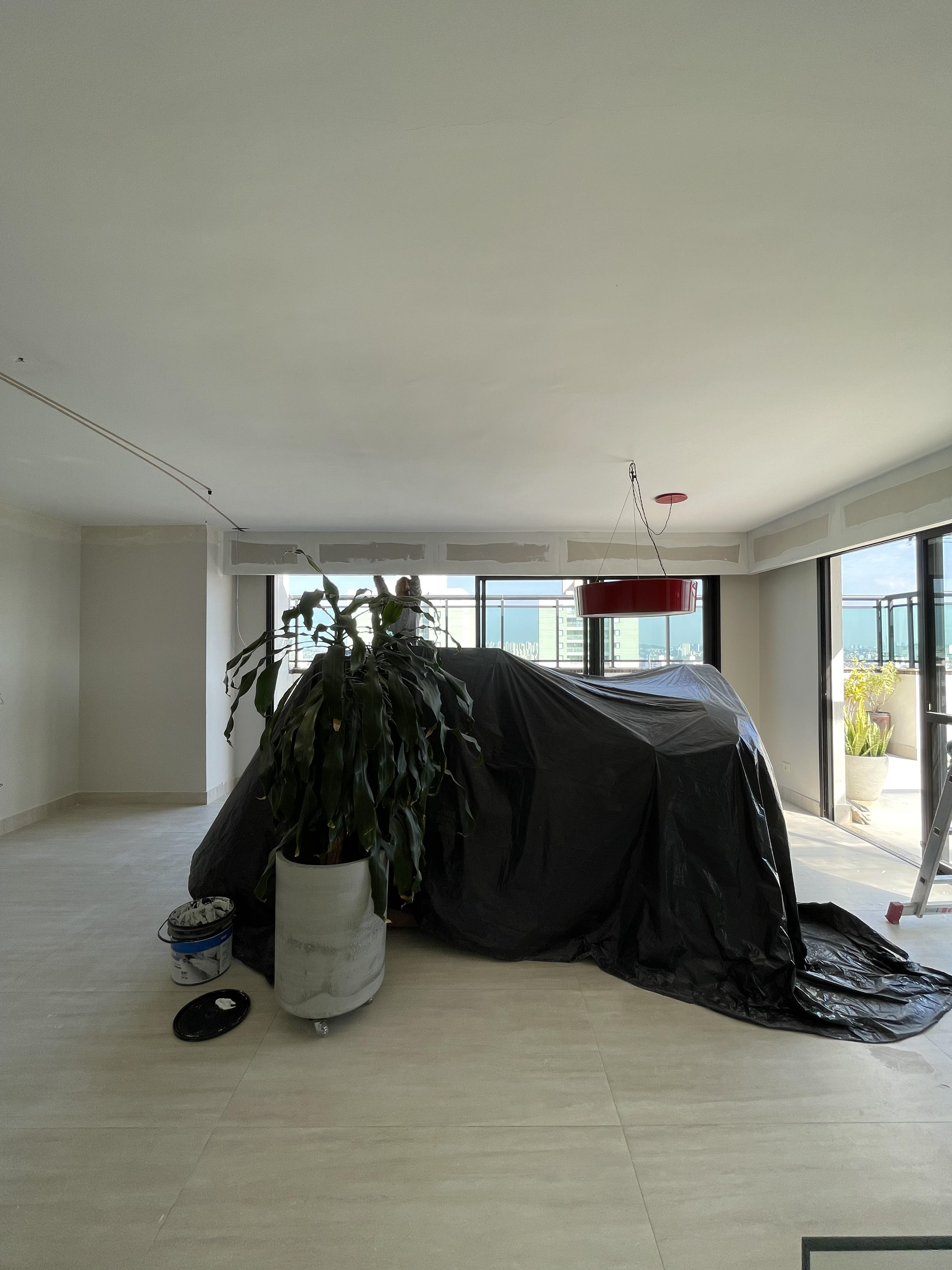 Foi feita a remoção da evaporadora do ar condicionado e ampliação da infra, adequação da elétrica do ar condicionado / Instalação das sancas cortineiro superior / Aplicação de nova demão de massa nas paredes da cozinha / instalação da parede de drywall no living inferior.