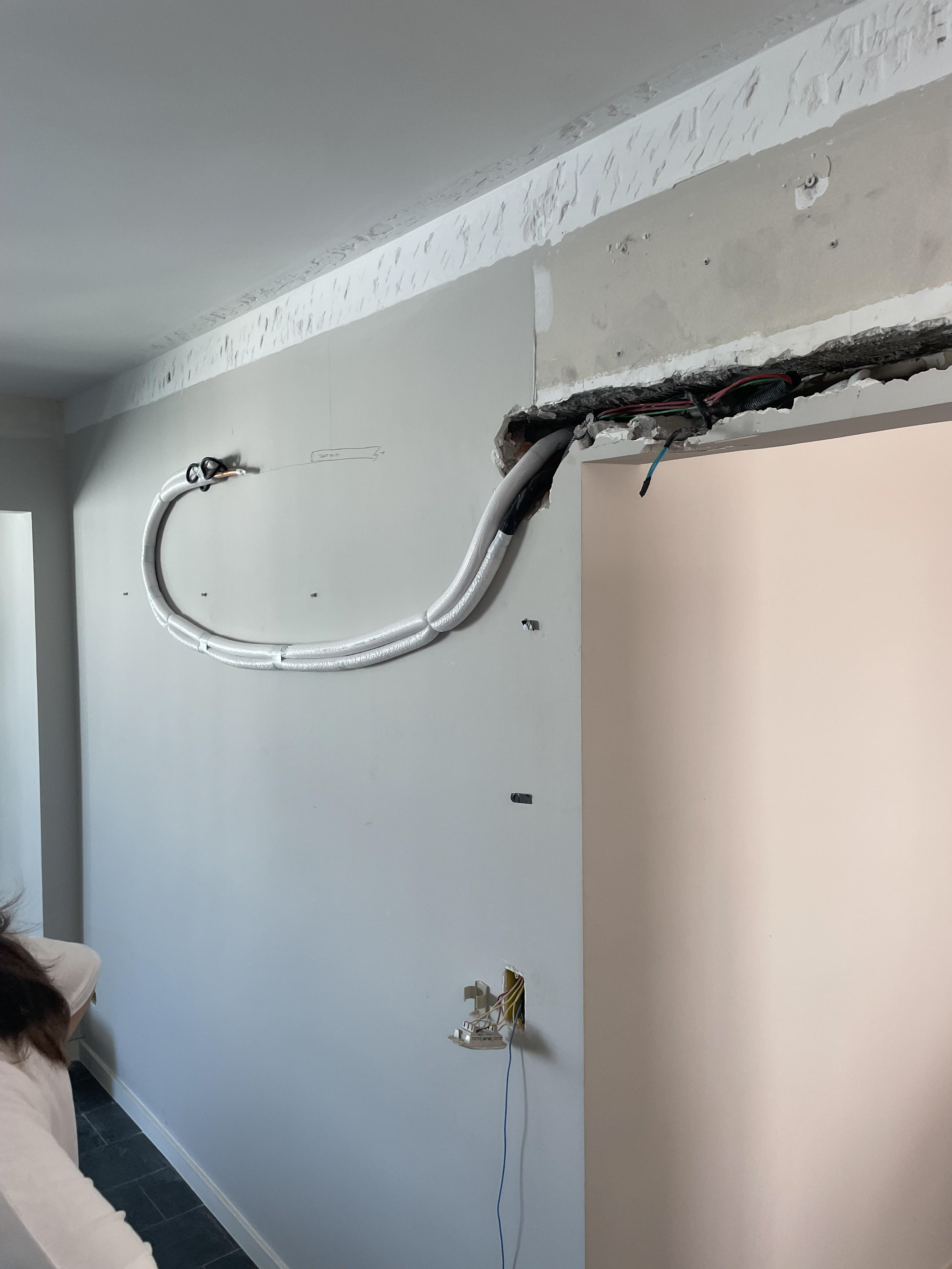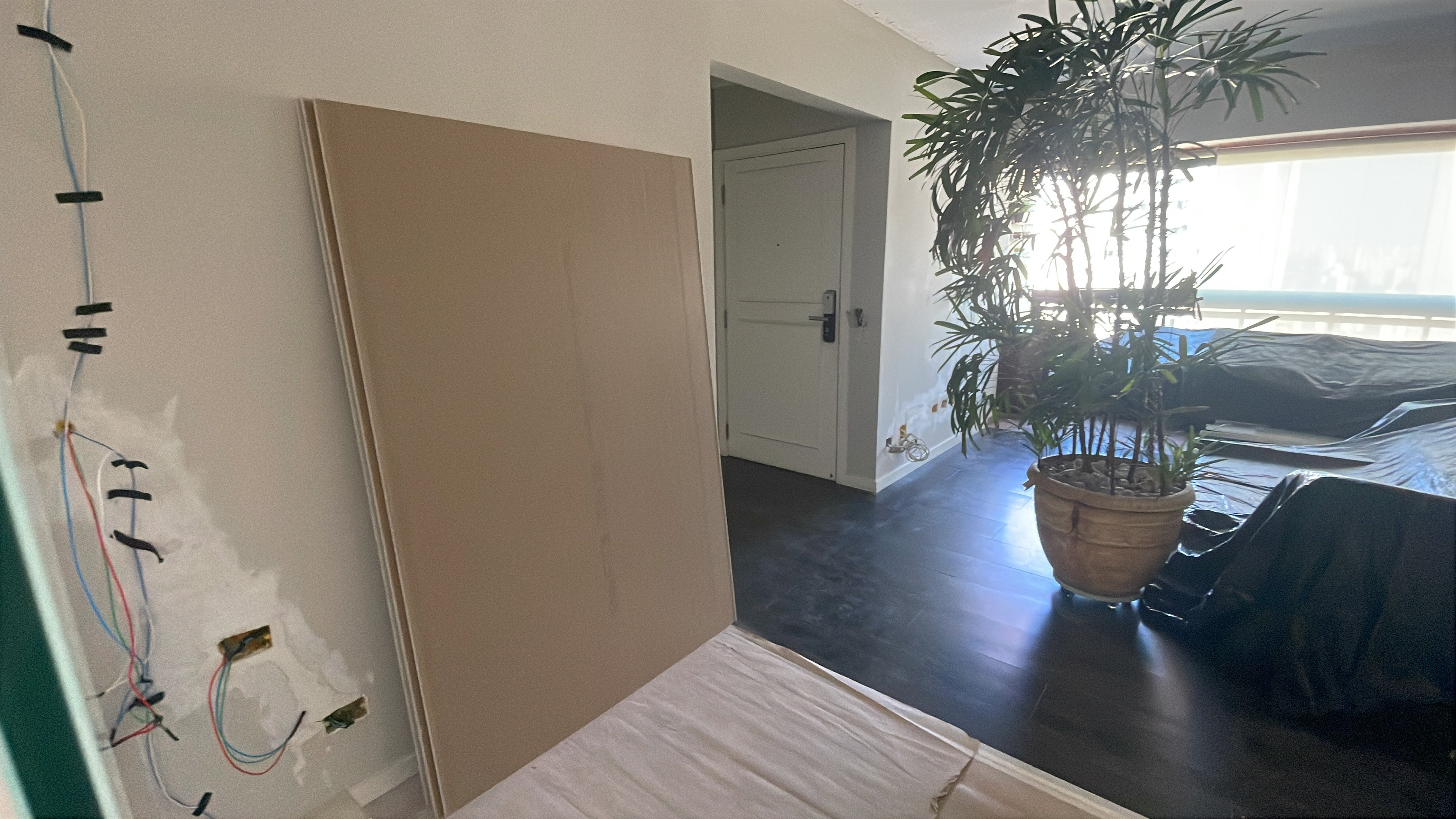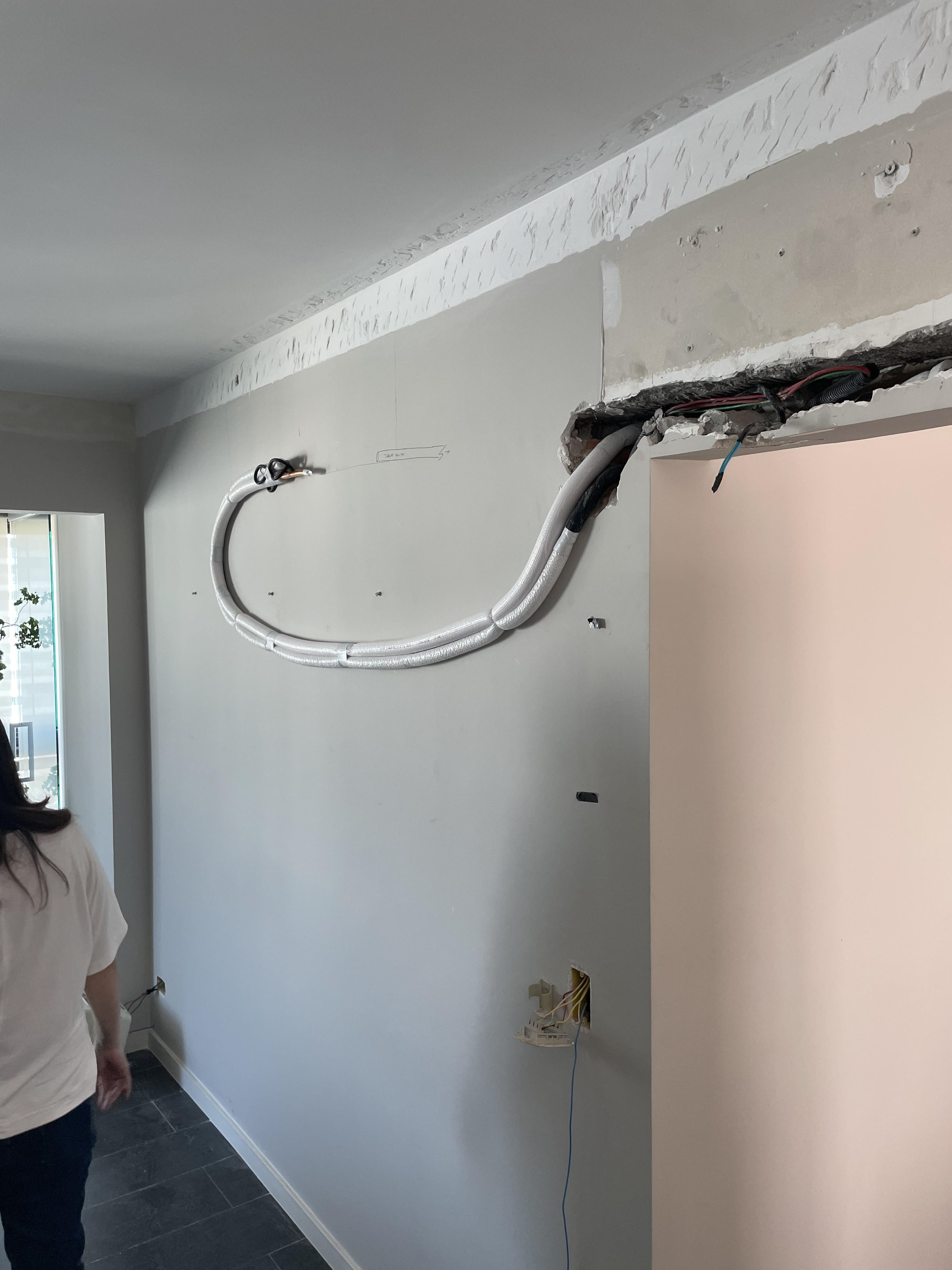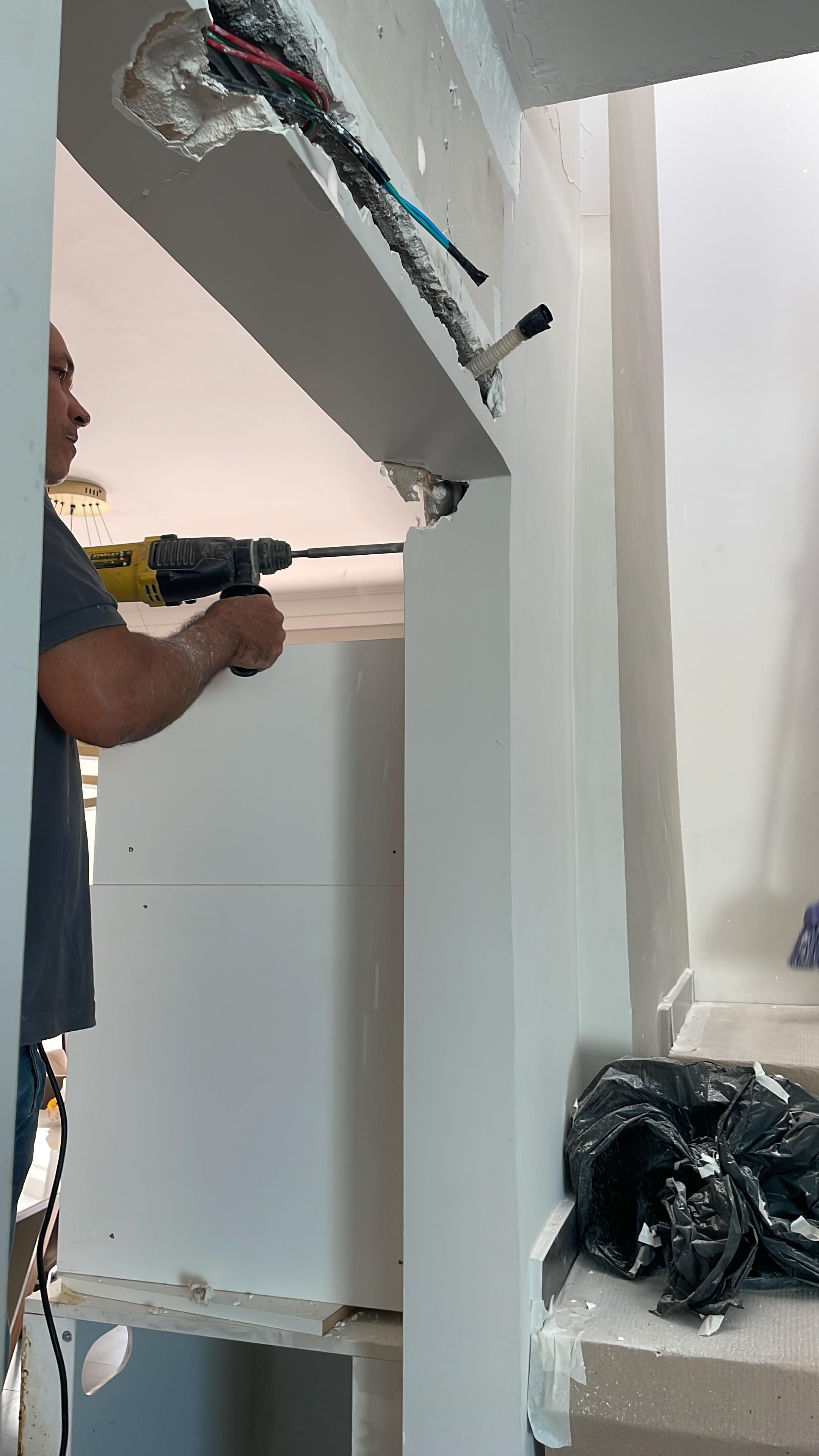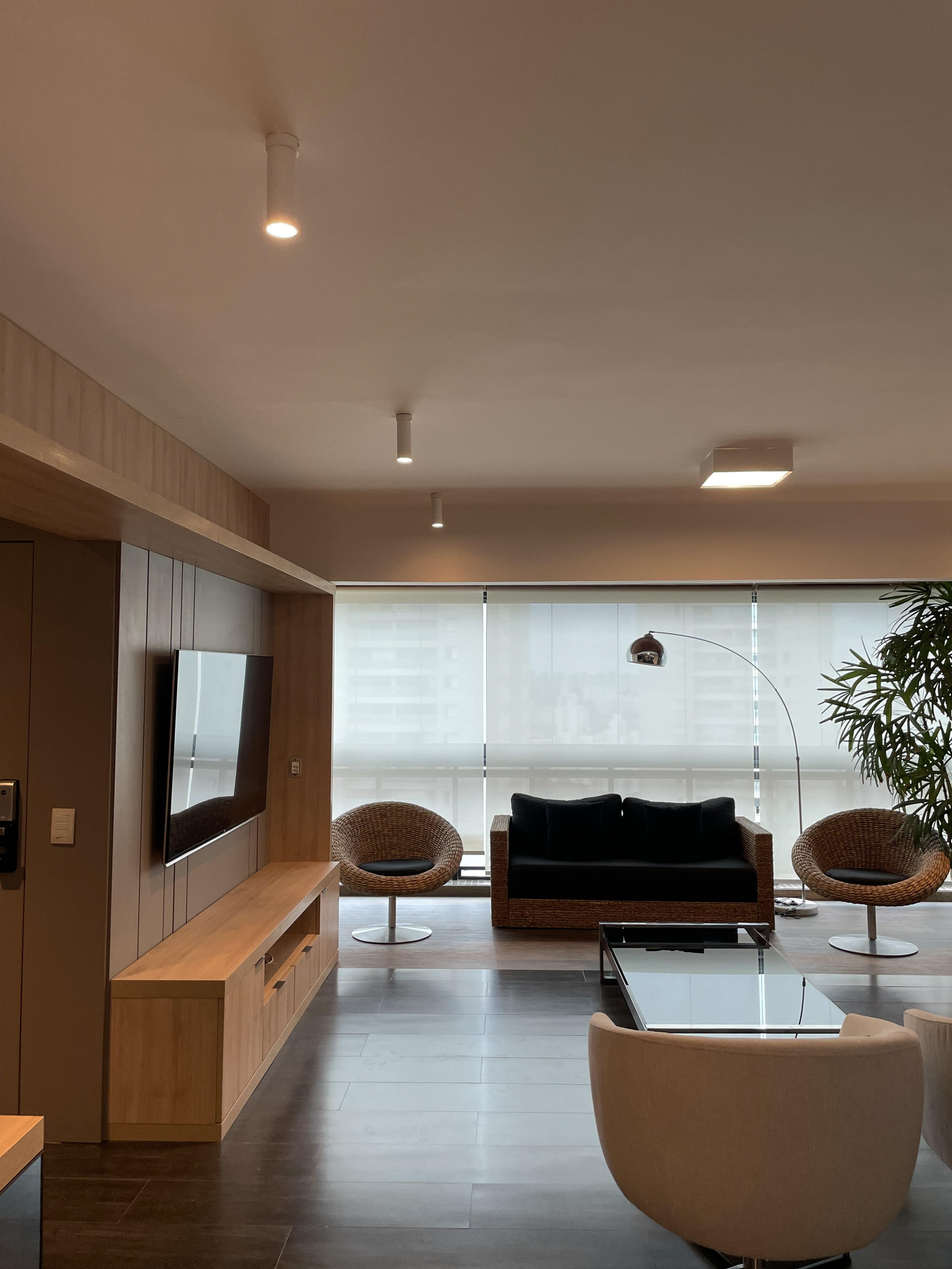 Foi feita a remoção da evaporadora do ar condicionado e ampliação da infra, adequação da elétrica do ar condicionado / Instalação das sancas cortineiro superior / Aplicação de nova demão de massa nas paredes da cozinha / instalação da parede de drywall no living inferior.