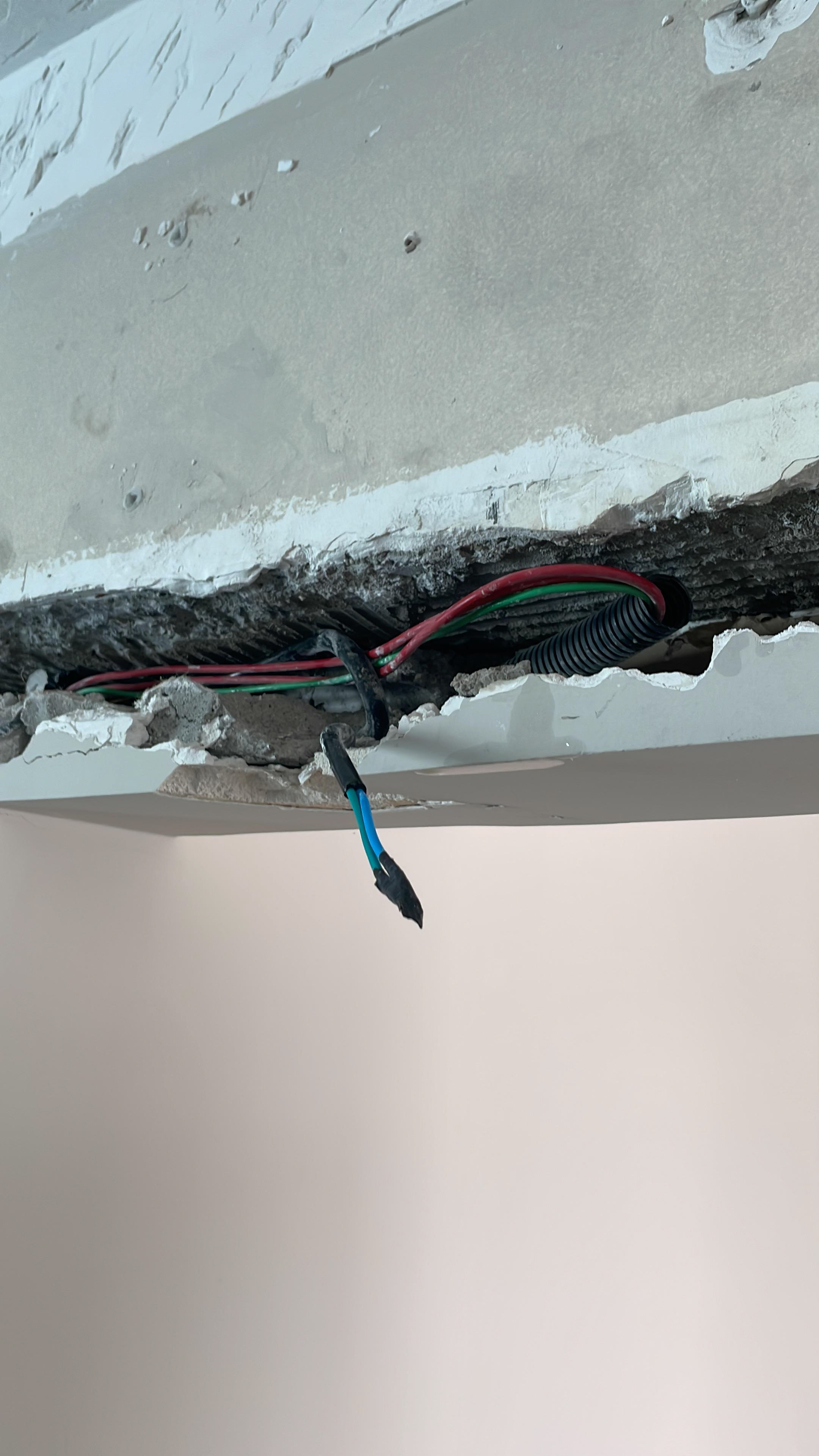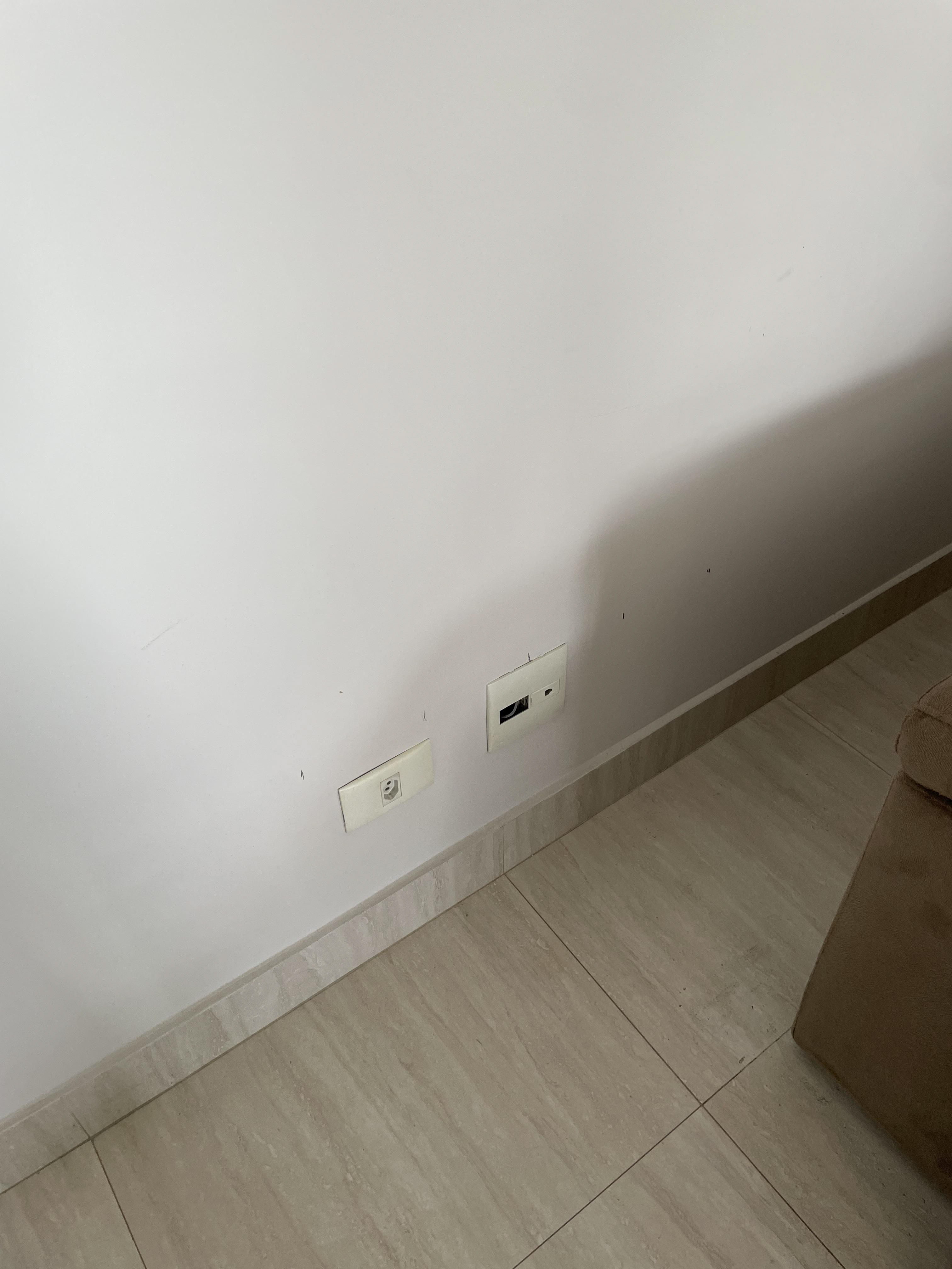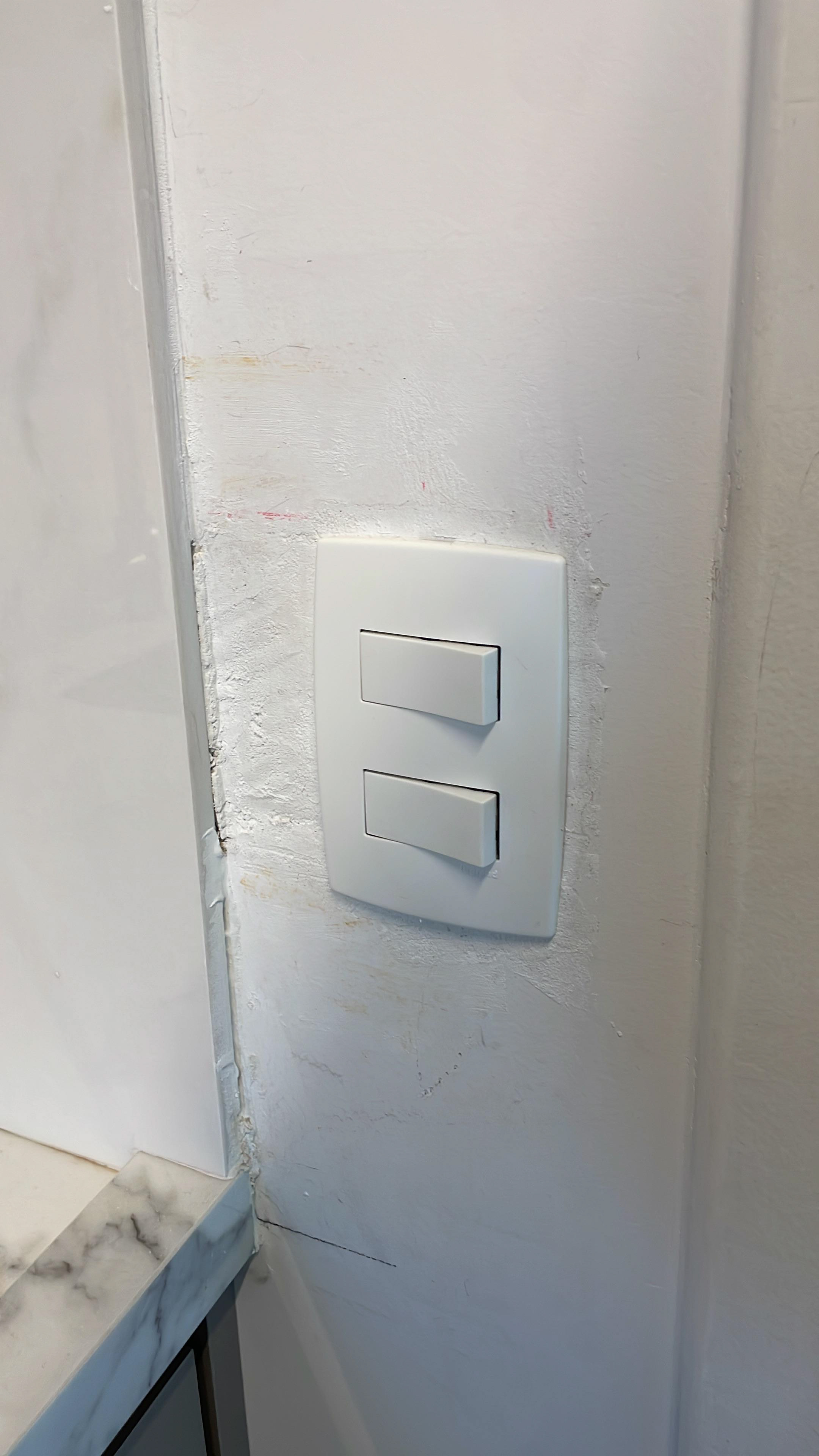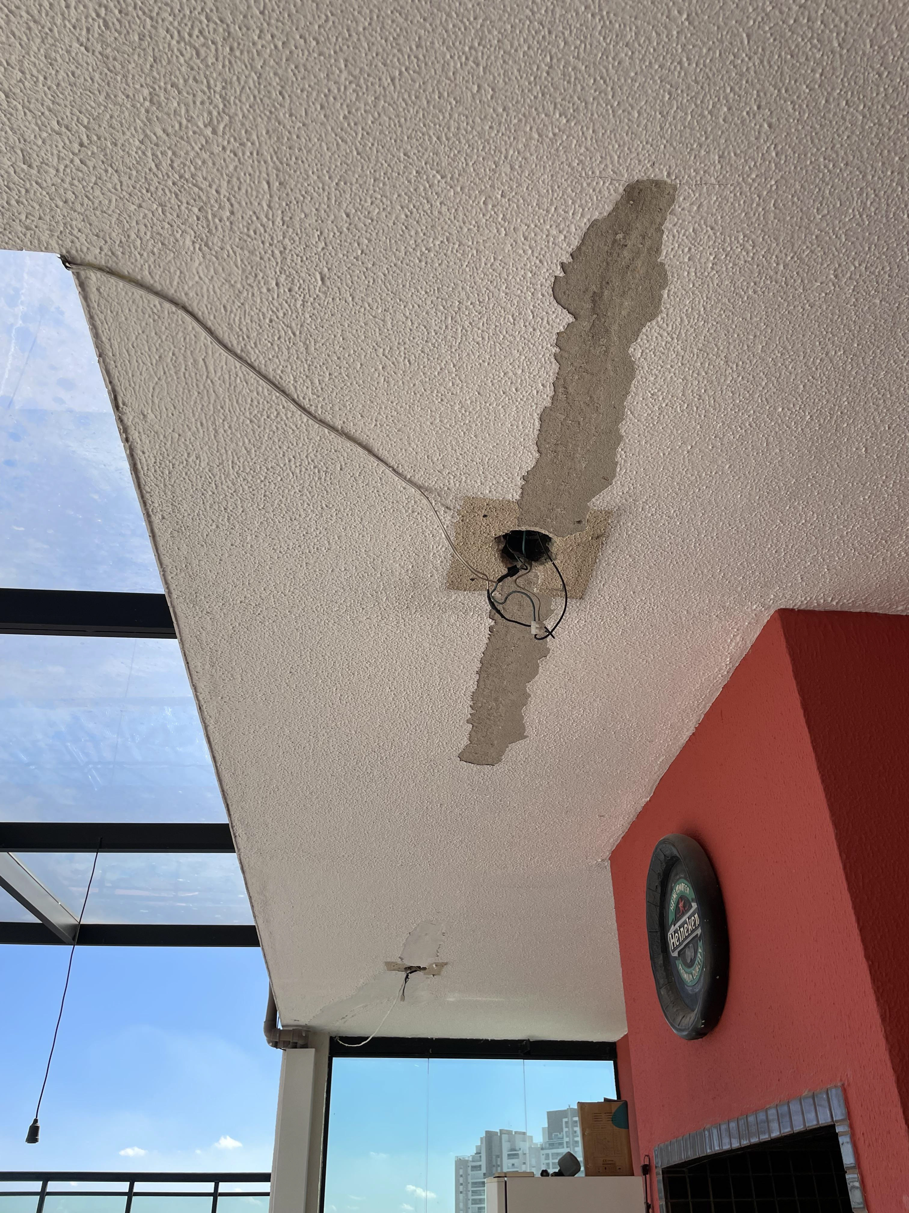 Pontos onde foi passado massa (o eletricista vai abrir uma passagem para instalar o fio, pois a fixação não funcionou)