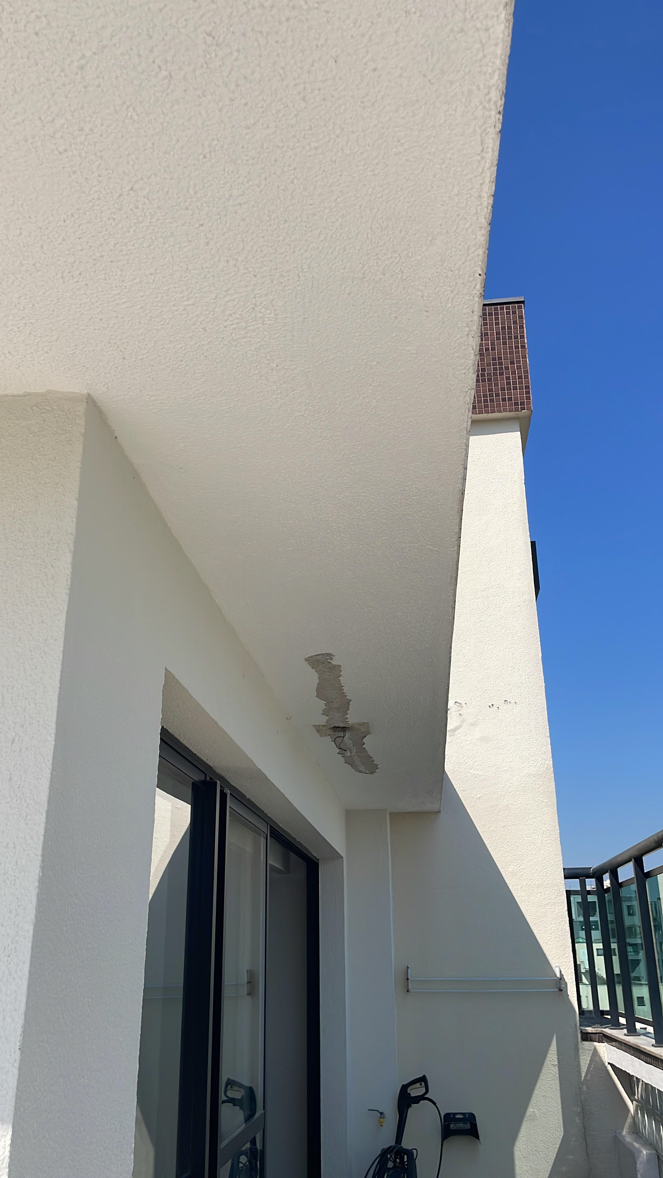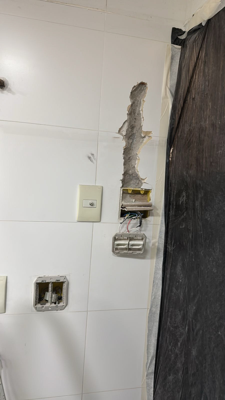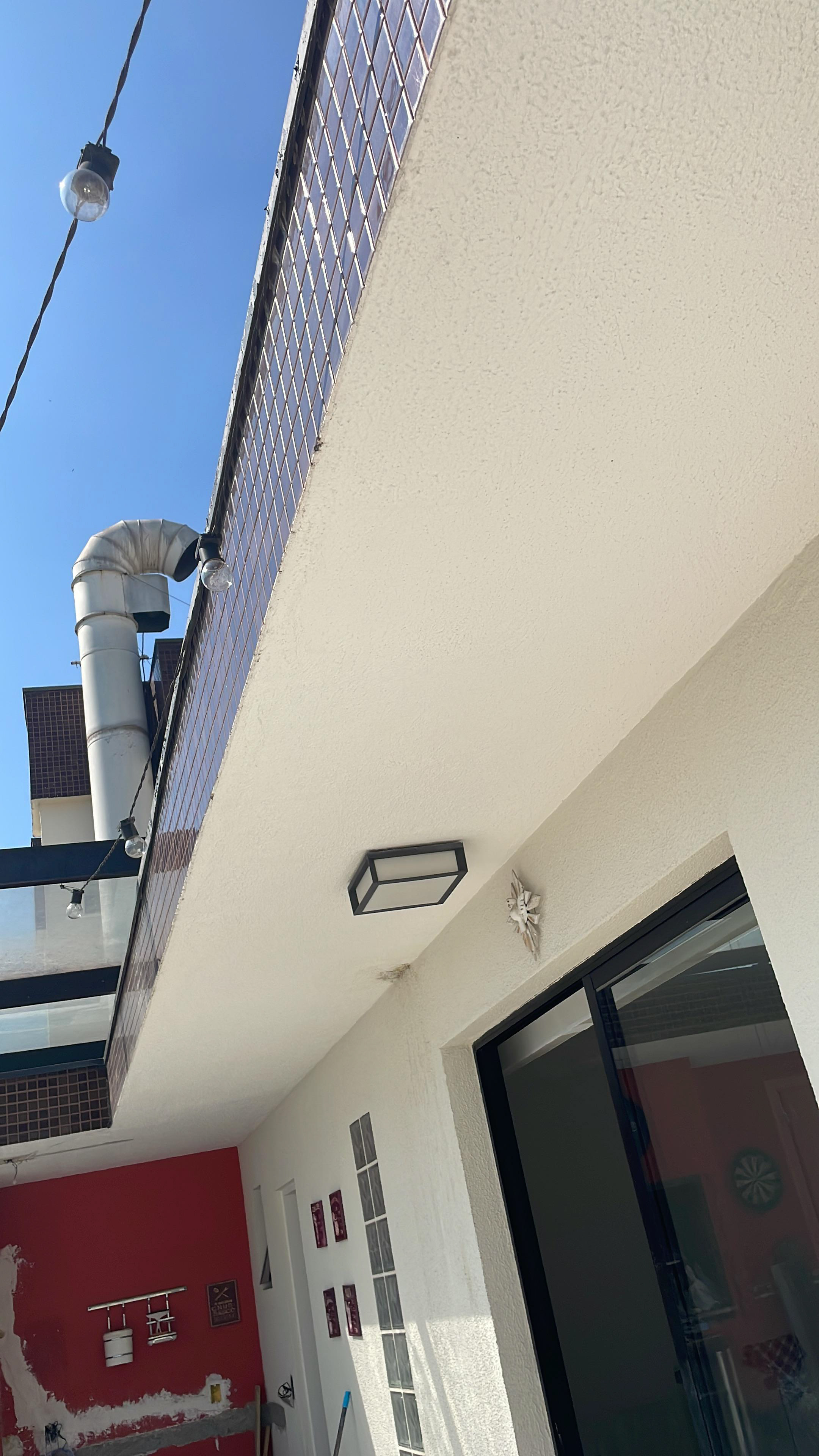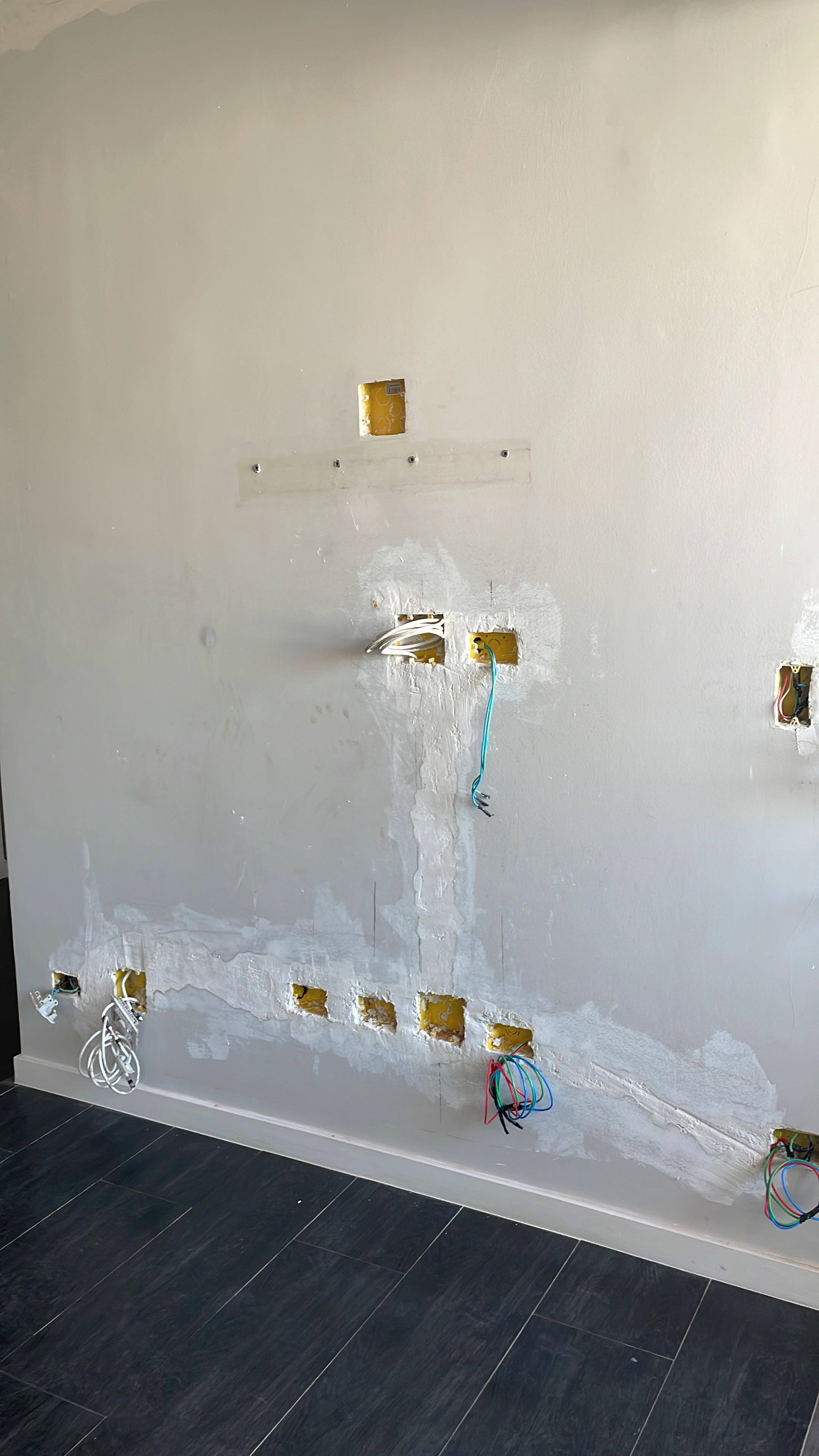 Pontos onde foi passado massa (o eletricista vai abrir uma passagem para instalar o fio, pois a fixação não funcionou)