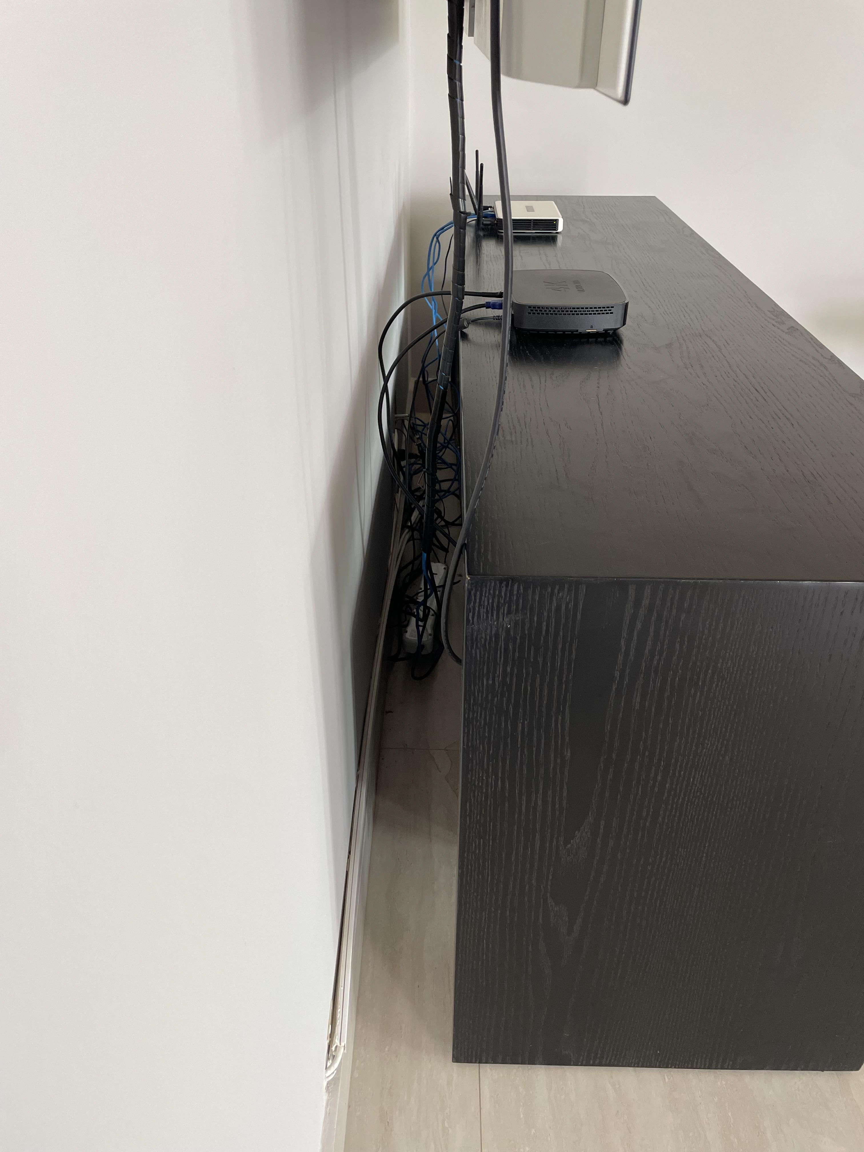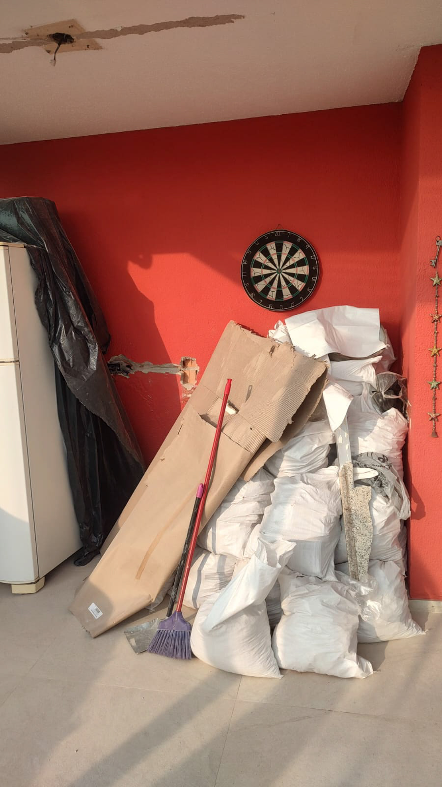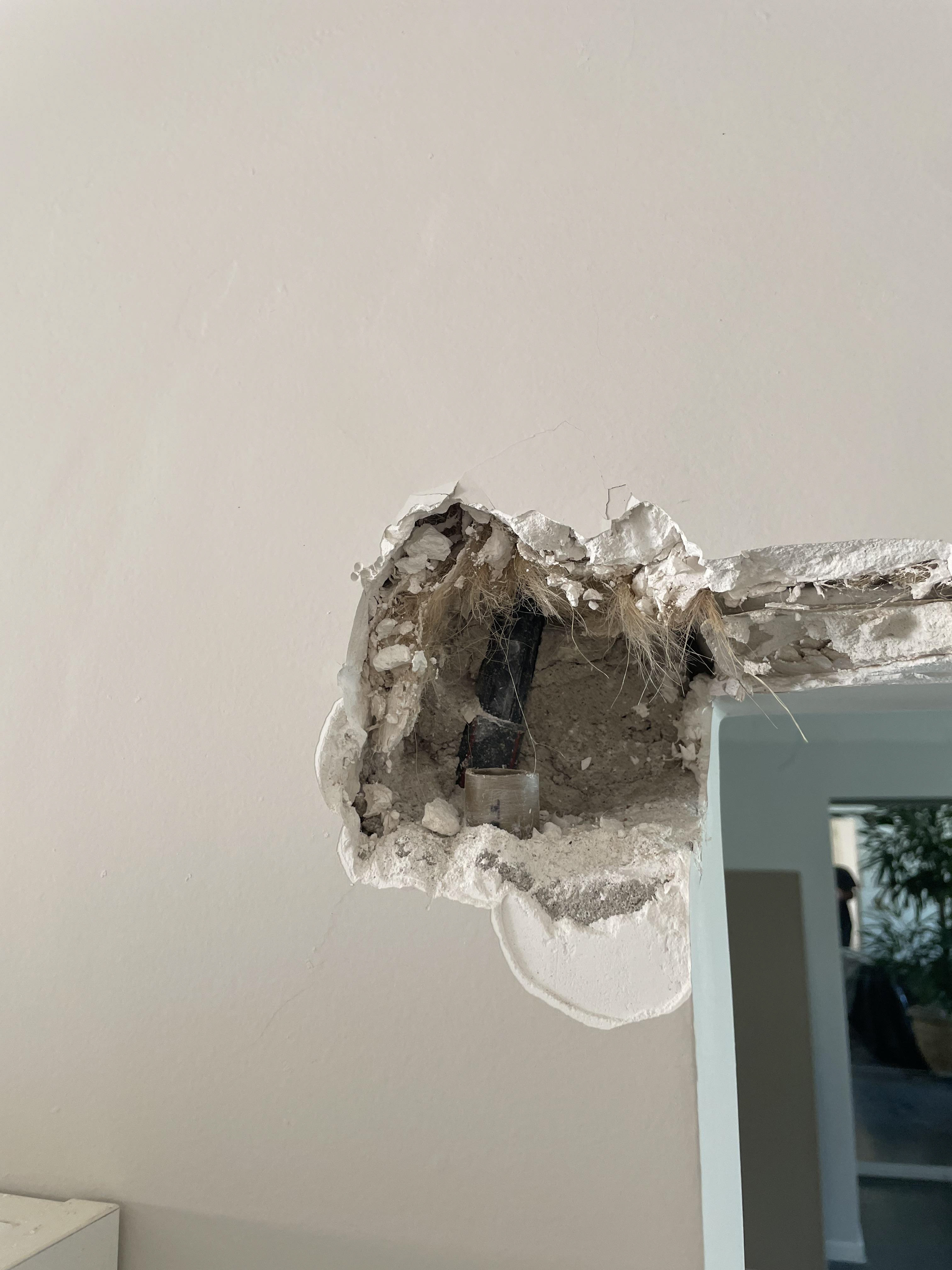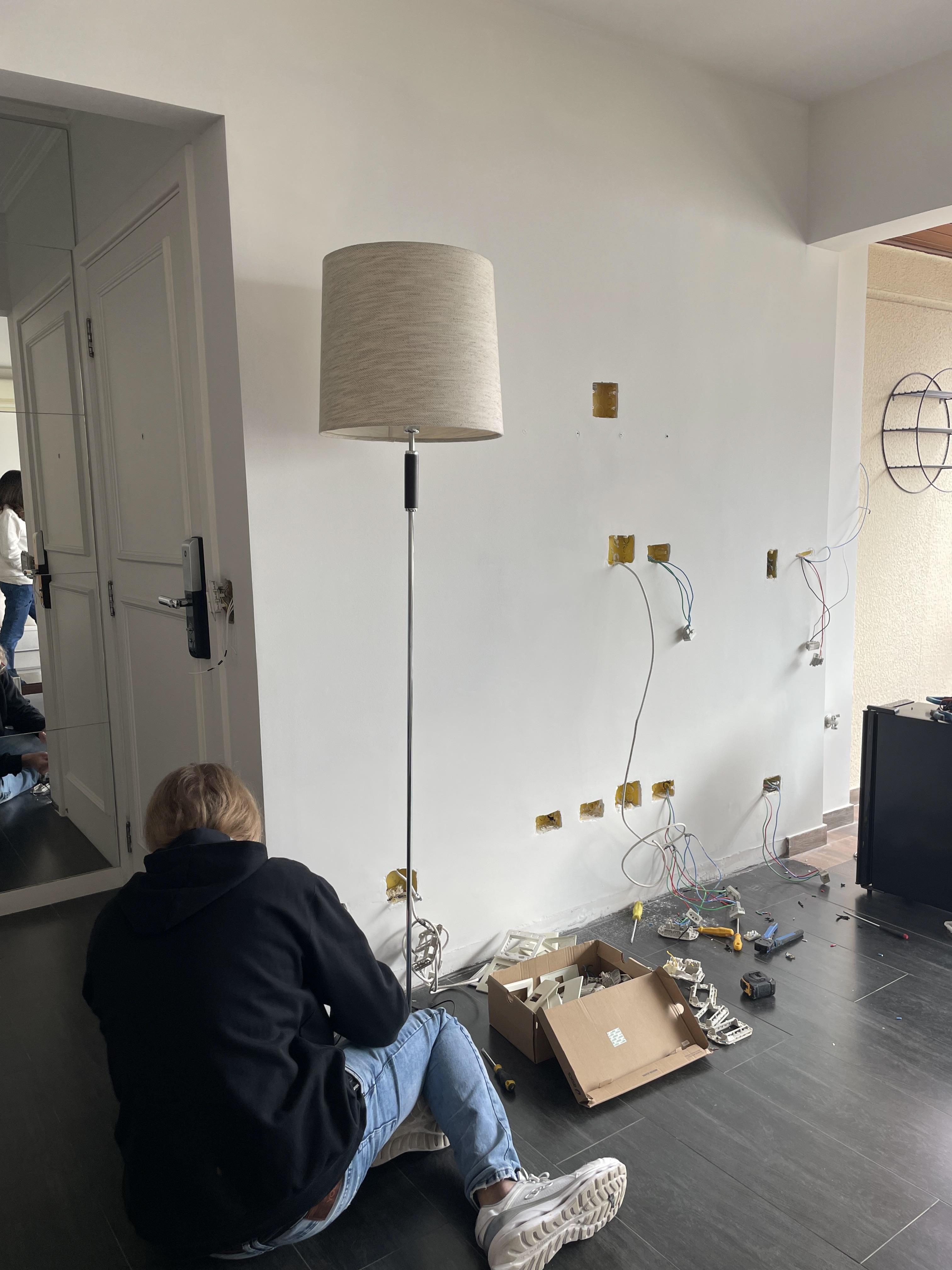Pontos onde foi passado massa (o eletricista vai abrir uma passagem para instalar o fio, pois a fixação não funcionou)