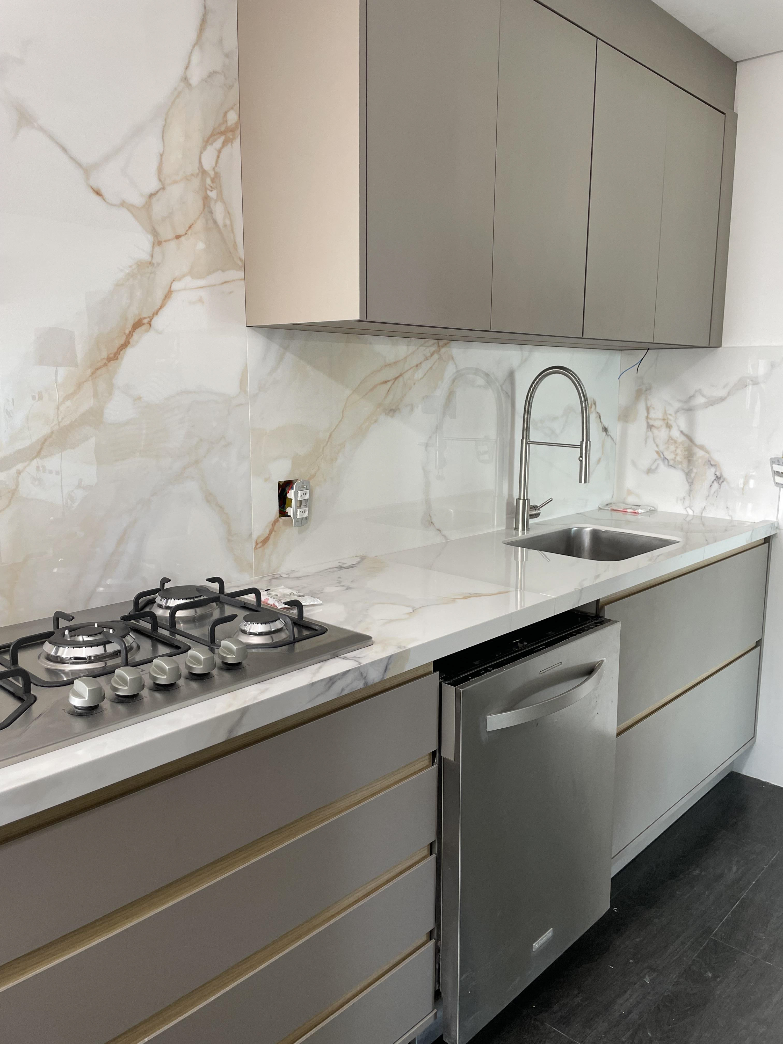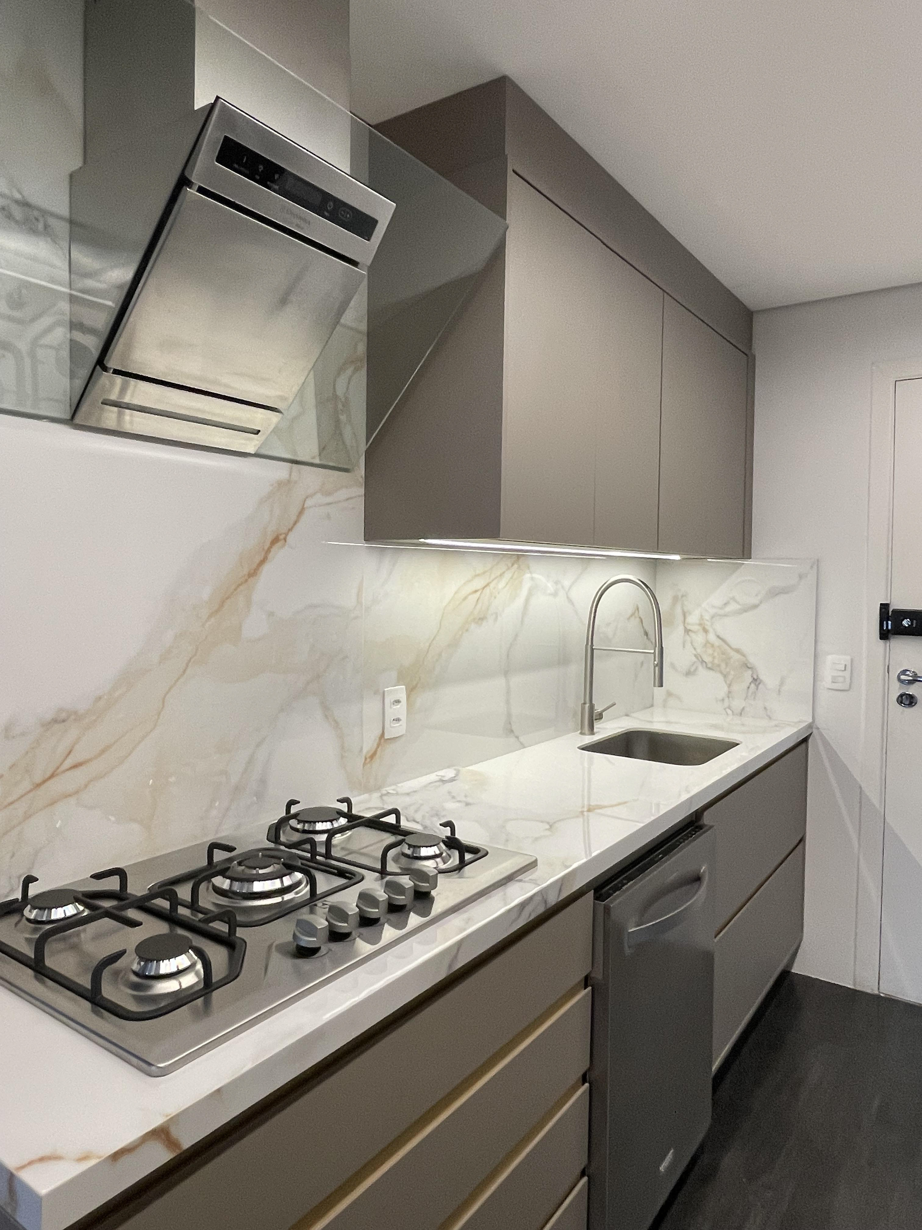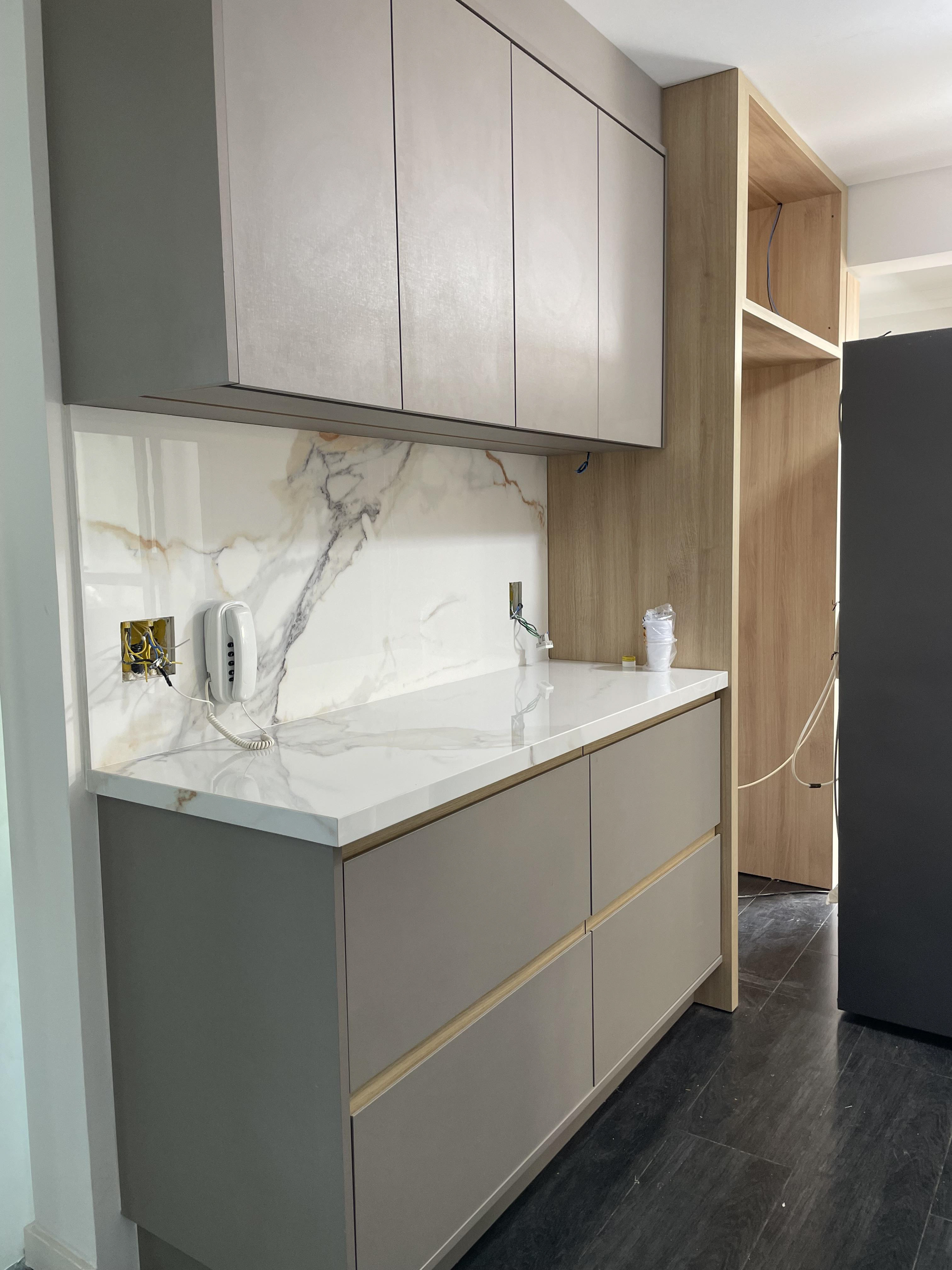 A marcenaria da cozinha está entregue e ficaram pendentes serviços dos demais ambientes, que dependem da marcenaria instalada.