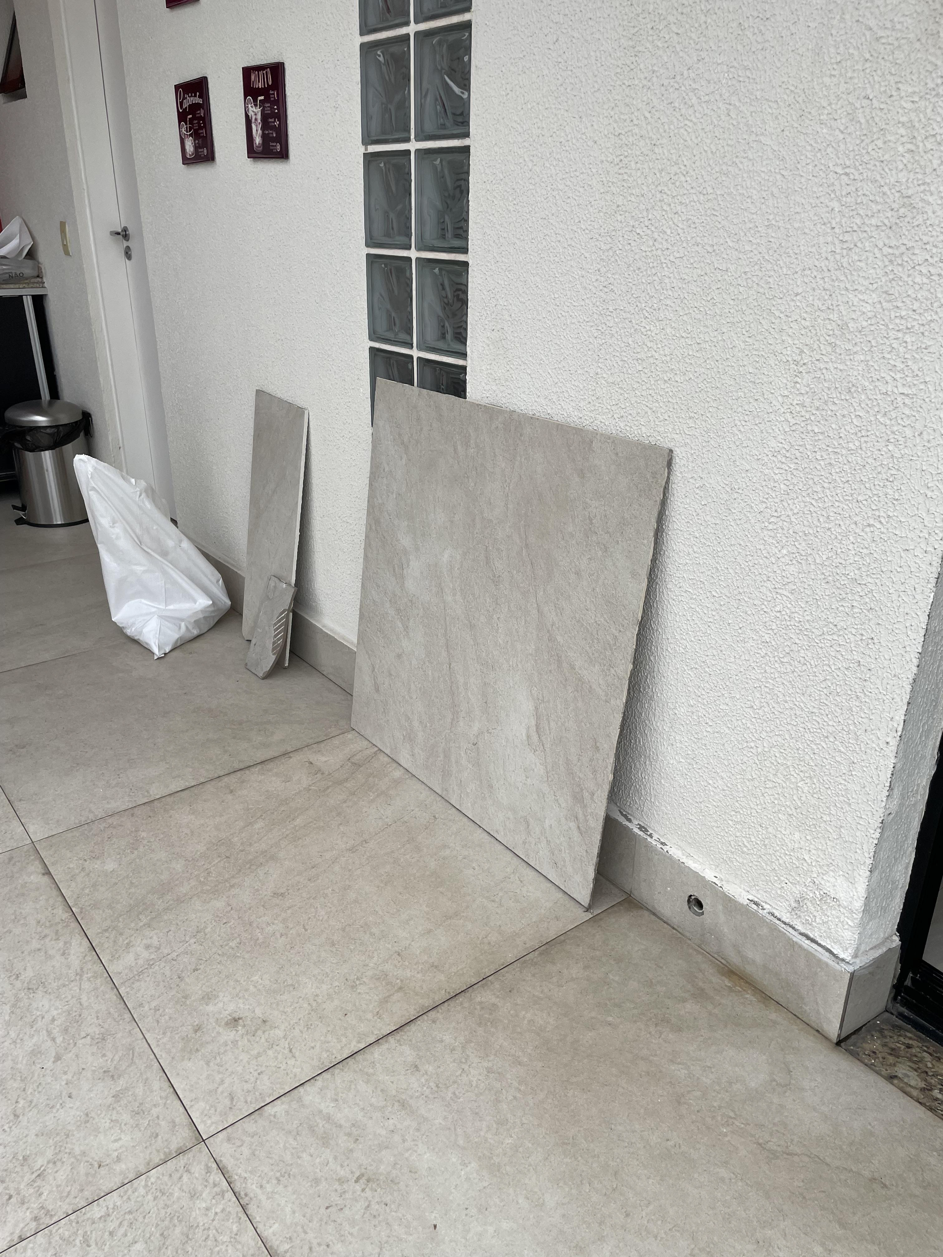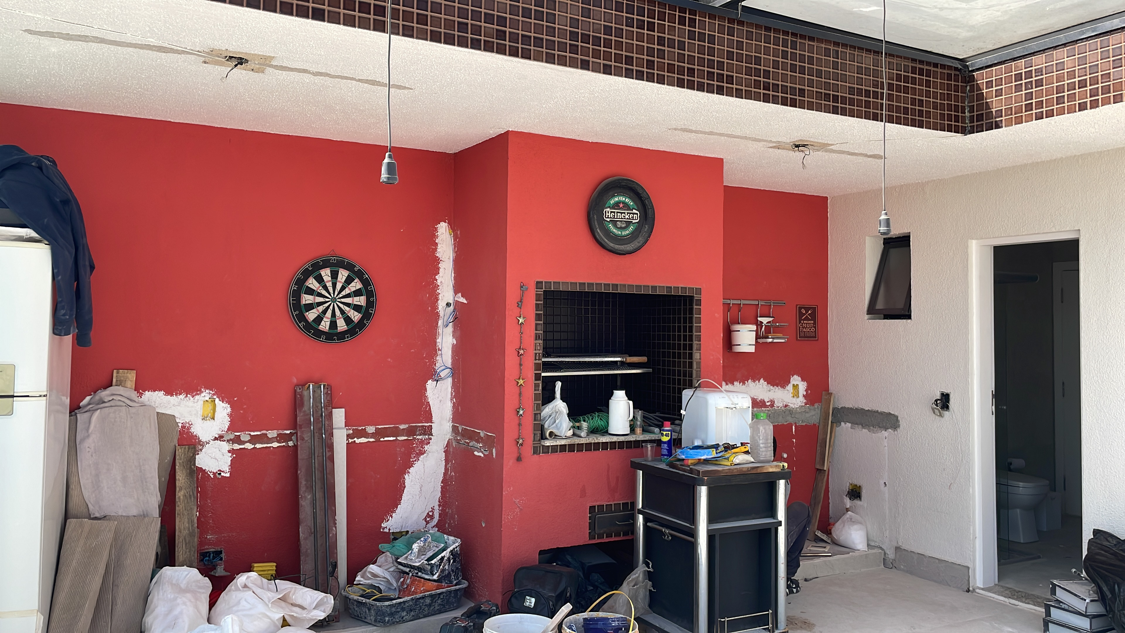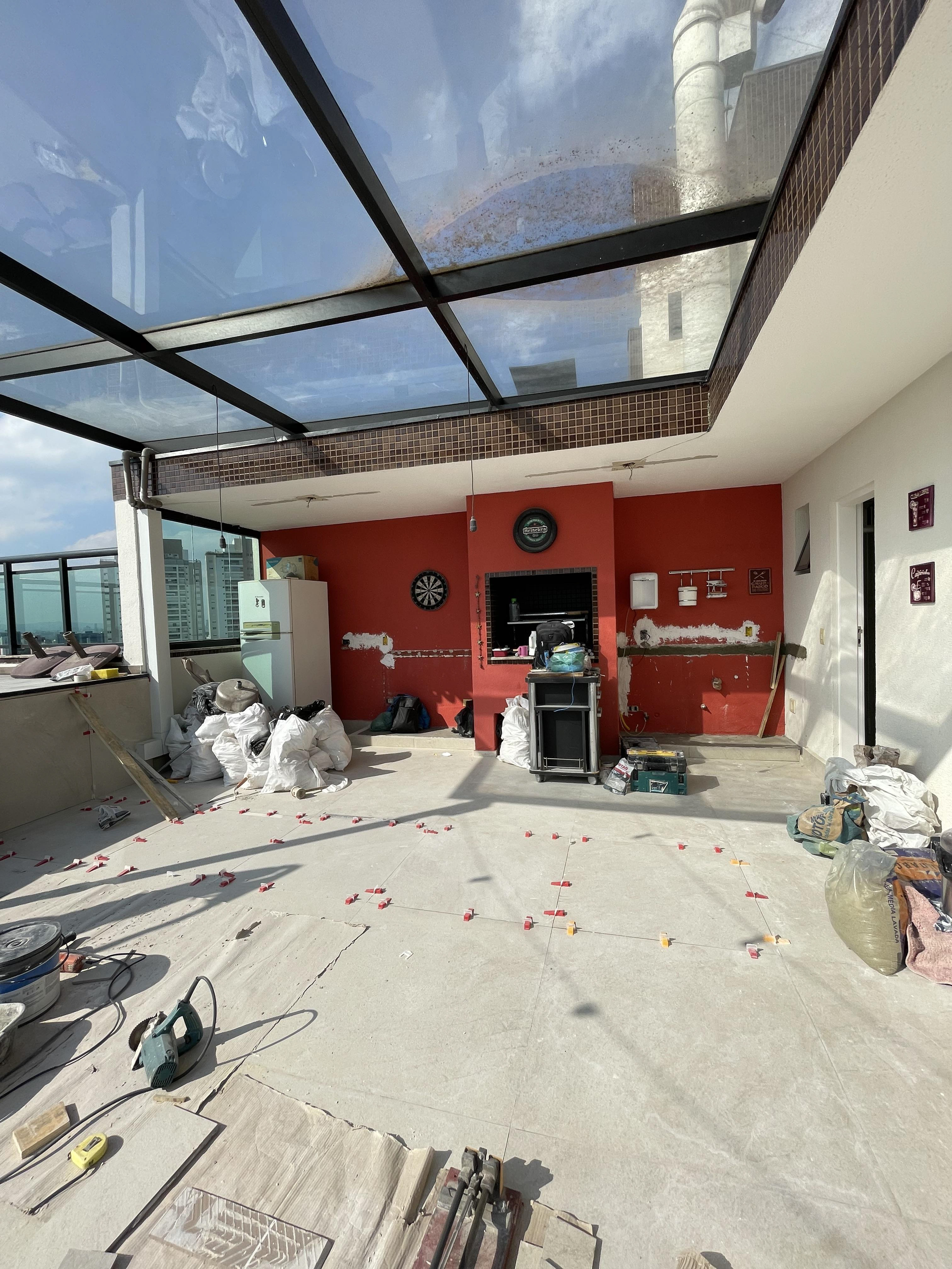 Novas peças do piso já foram instaladas onde foi retirada a bancada; bases em alvenaria para os móveis da churrasqueira instalados / Regularização das paredes onde saíram as molduras de gesso em ambas as salas / Elétrica da parte superior ok (apenas as luminárias pendentes - que são acabamento) / Regularização das paredes da cozinha também estão ok (segunda demão na sexta feira e, se necessário, terceira demão na segunda feira.