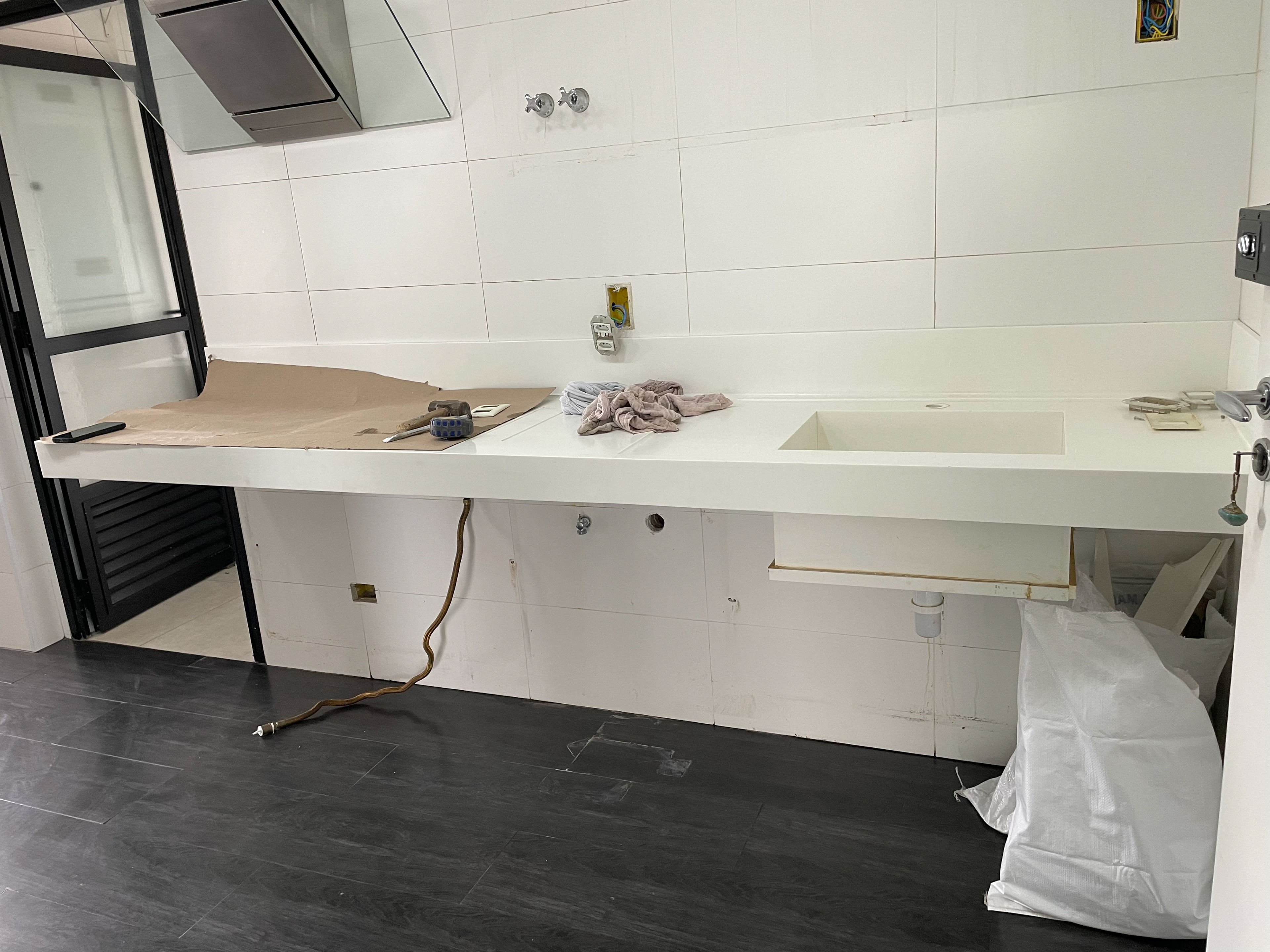 Marcenaria e bancadas da cozinha removidas (as peças que não serão alteradas foram deixadas no apartamento) / Elétrica com pontos de tomada e iluminação marcados na parte superior da casa e na cozinha / Civil já removeu a bancada da área externa.