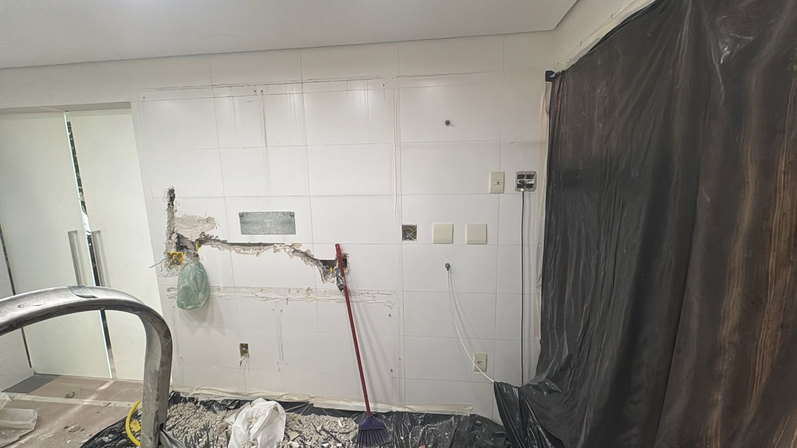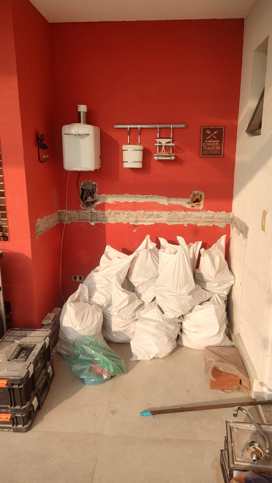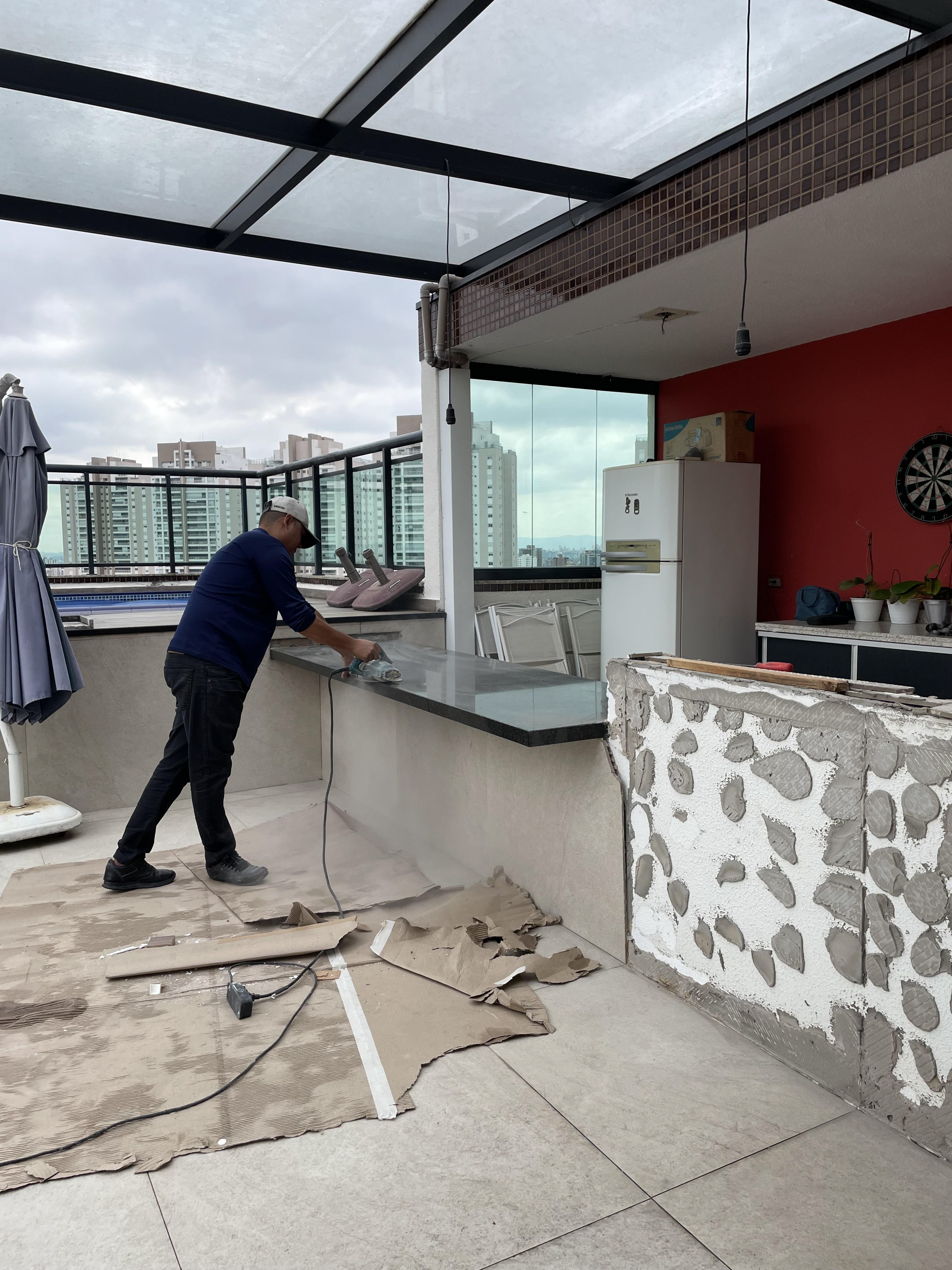 Atividades realizadas: Marcação, corte e chamamento dos pontos de tomada na churrasqueira e cozinha; Remoção da "ilha" e bancadas da churrasqueira e cozinha.