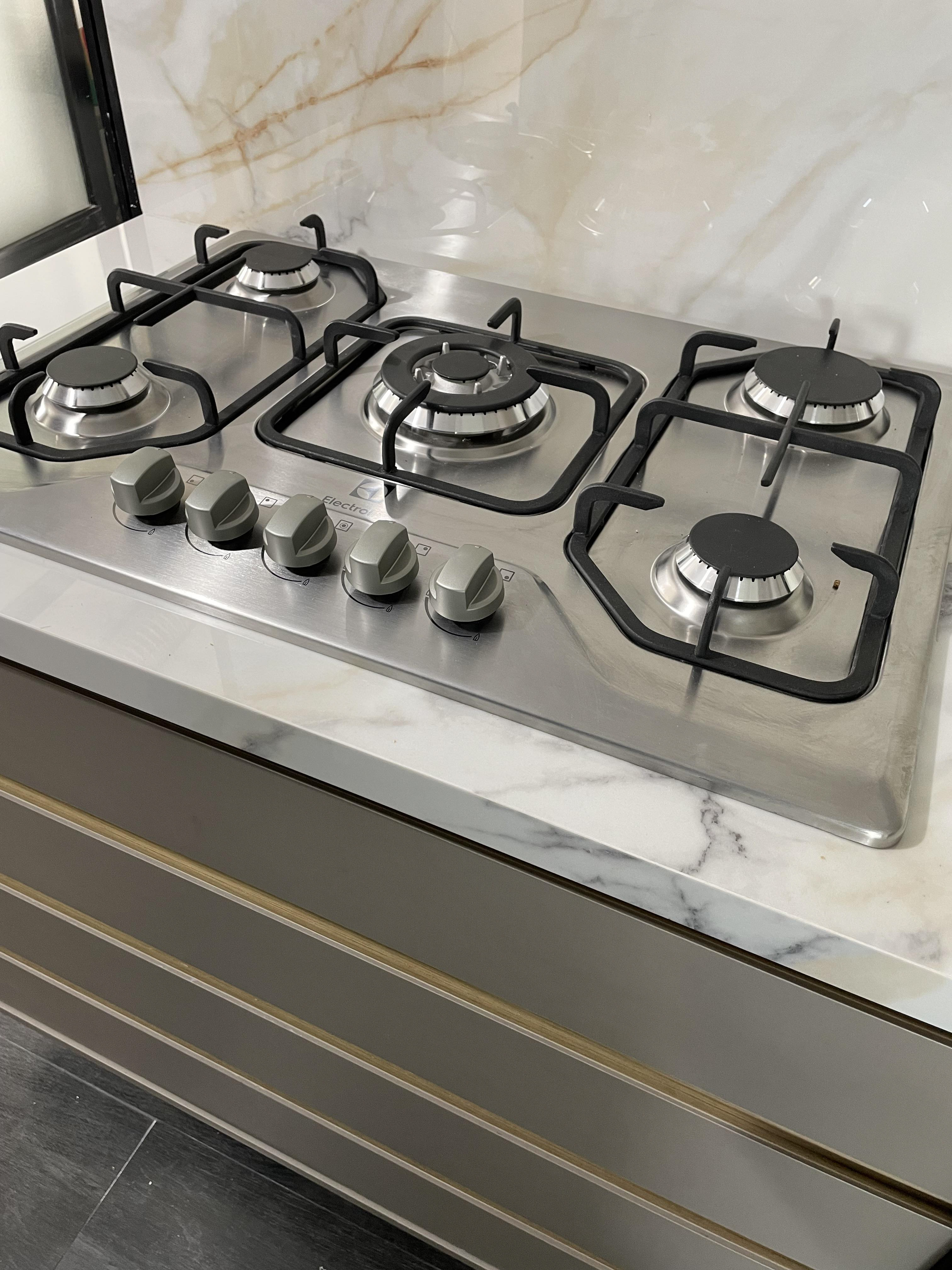 *Instalação de coifa está pendente / avaliar com a assistência técnica / Está pendente a aprovação do novo orçamento para revestir a parte interna da churrasqueira em lâmina ultracompacta.