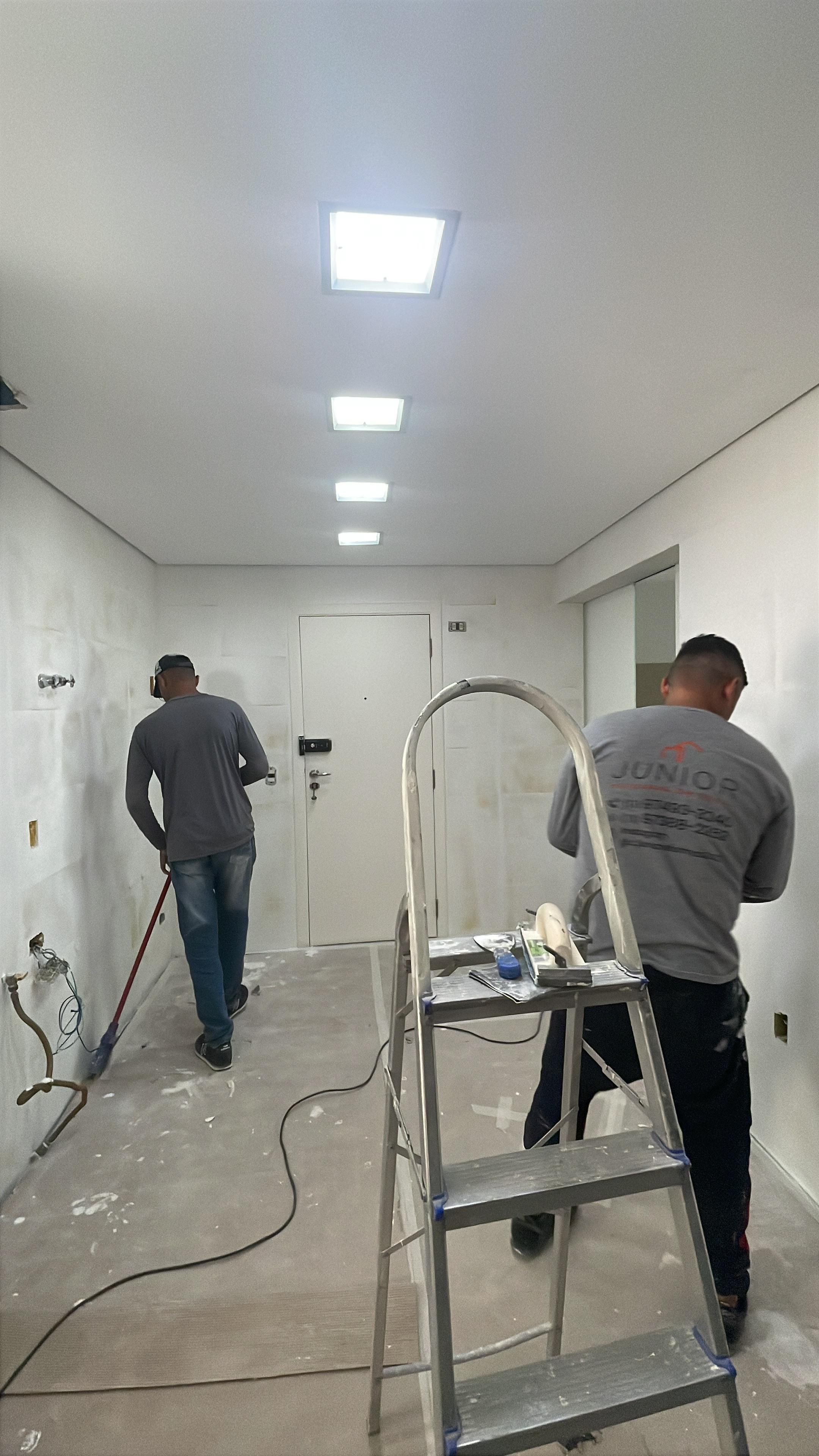 Foi feita a marcação dos pontos de iluminação da cozinha e fechamento do vão das antigas luminárias / As paredes da cozinha - que são a prioridade - já estão sendo preparadas para pintura;