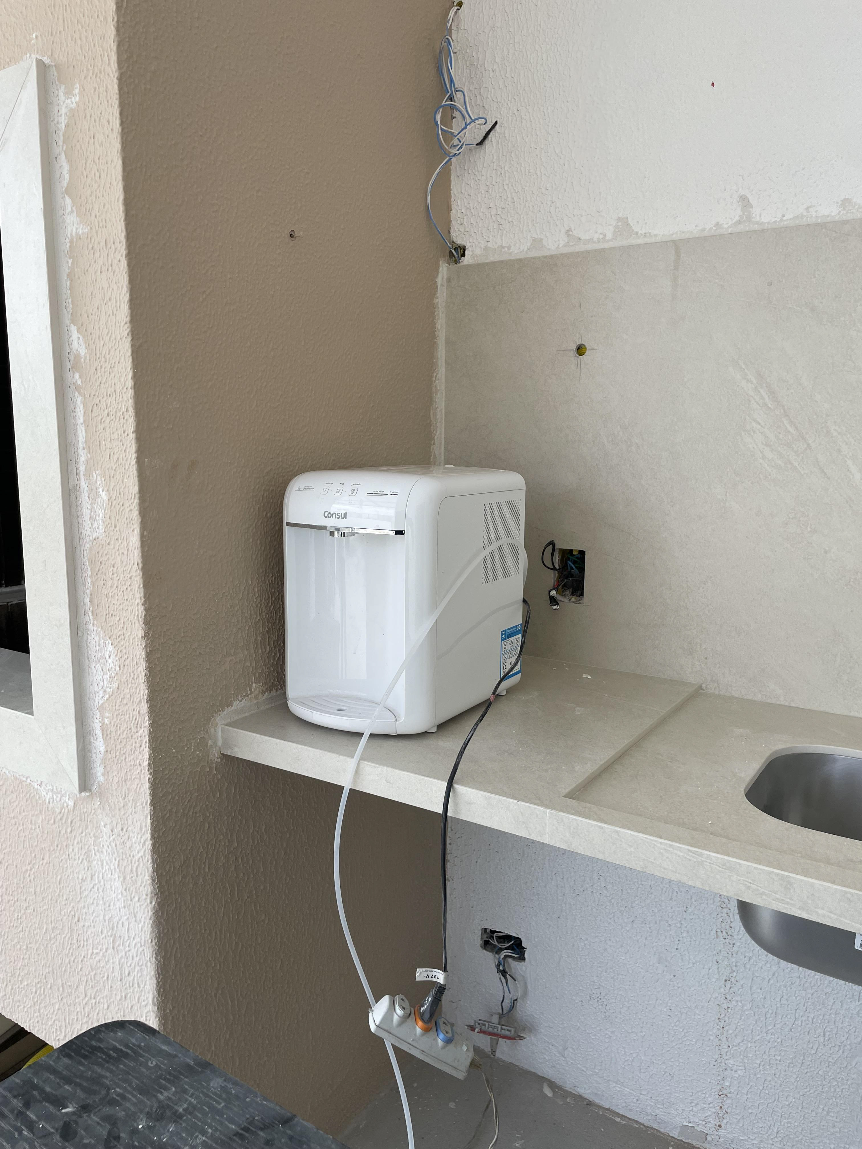 Estão pendentes a instalação da torneira da churrasqueira e o desenho da prateleira para o purificador de água. / Os meninos ficaram de passar data de retorno.