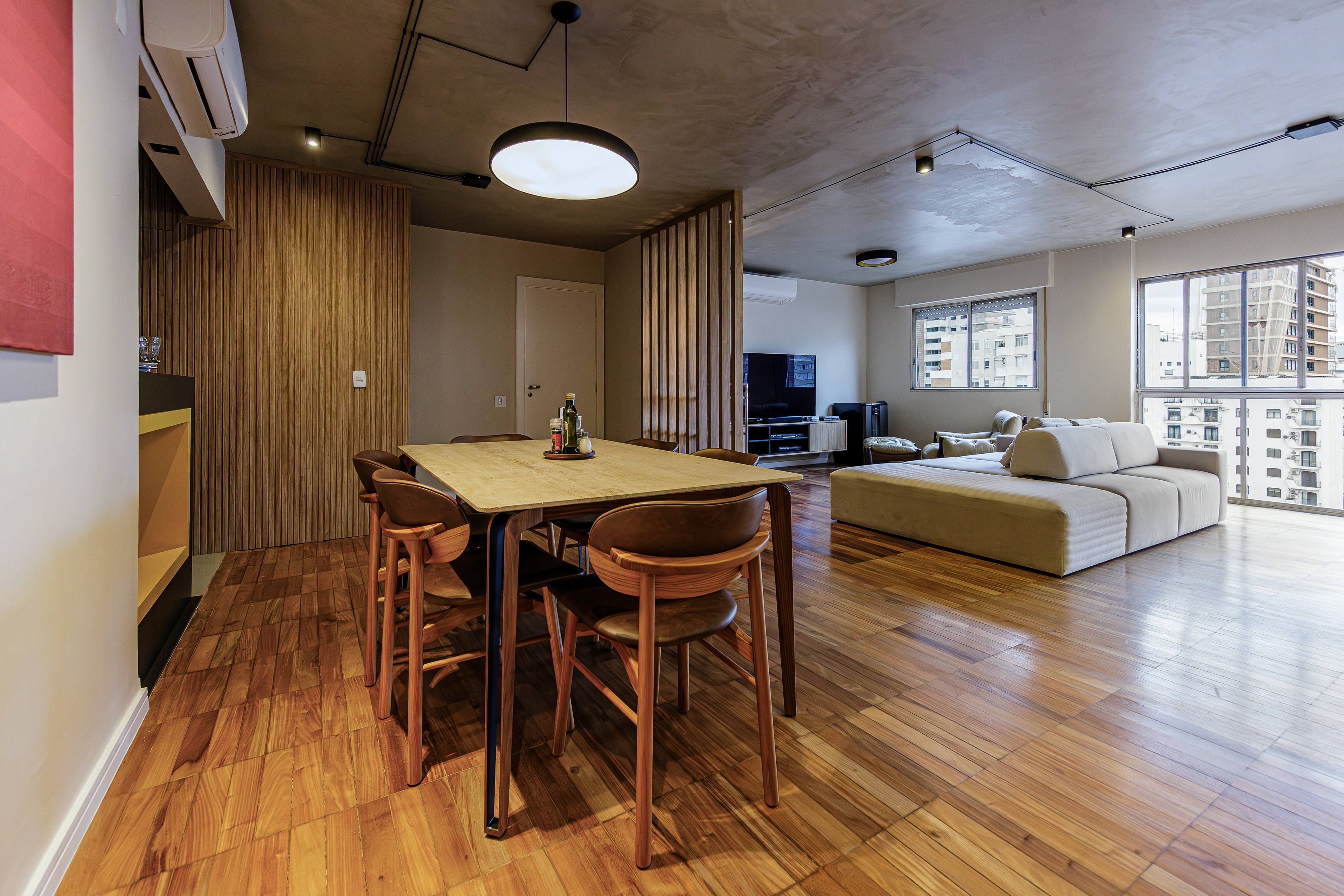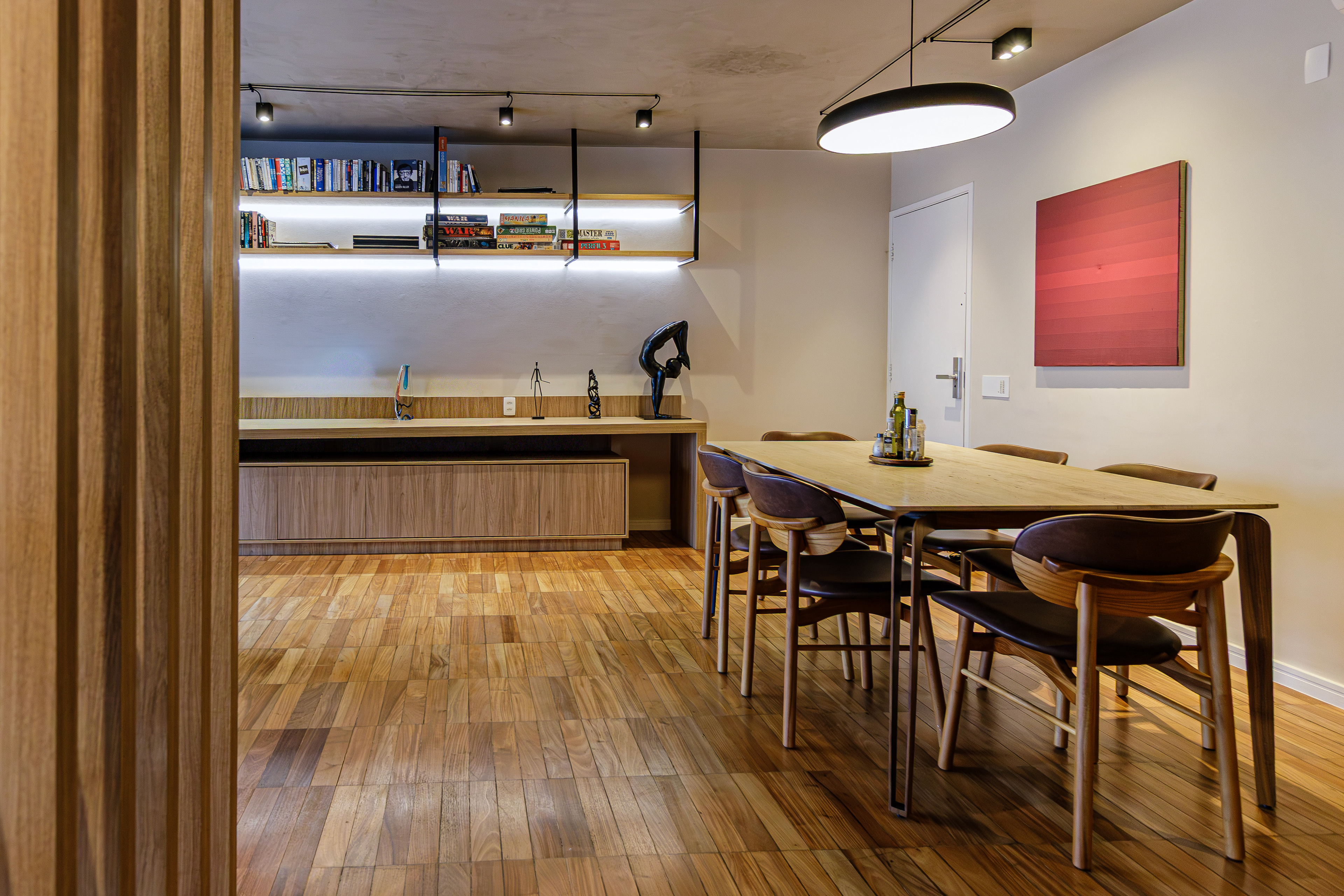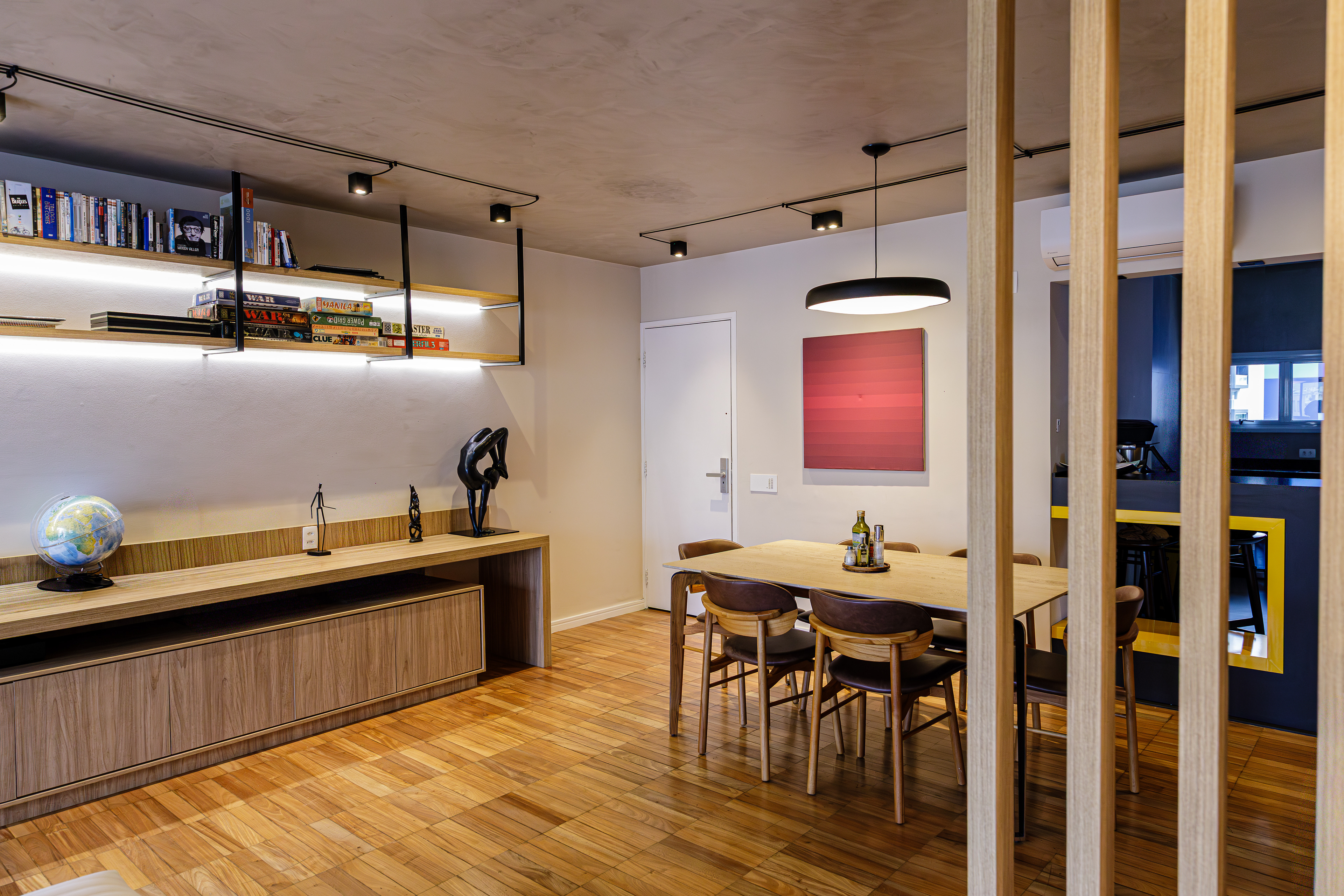 A atmosfera ganha personalidade com o toque industrial do metalon e a modernidade da iluminação em cabos aparentes. Mas é a madeira quente e os spots de luz amarela que trazem o aconchego necessário para o convívio. A divisão? Sutil e elegante, feita por uma estrutura ripada que permite que a luz e as conversas circulem livremente.